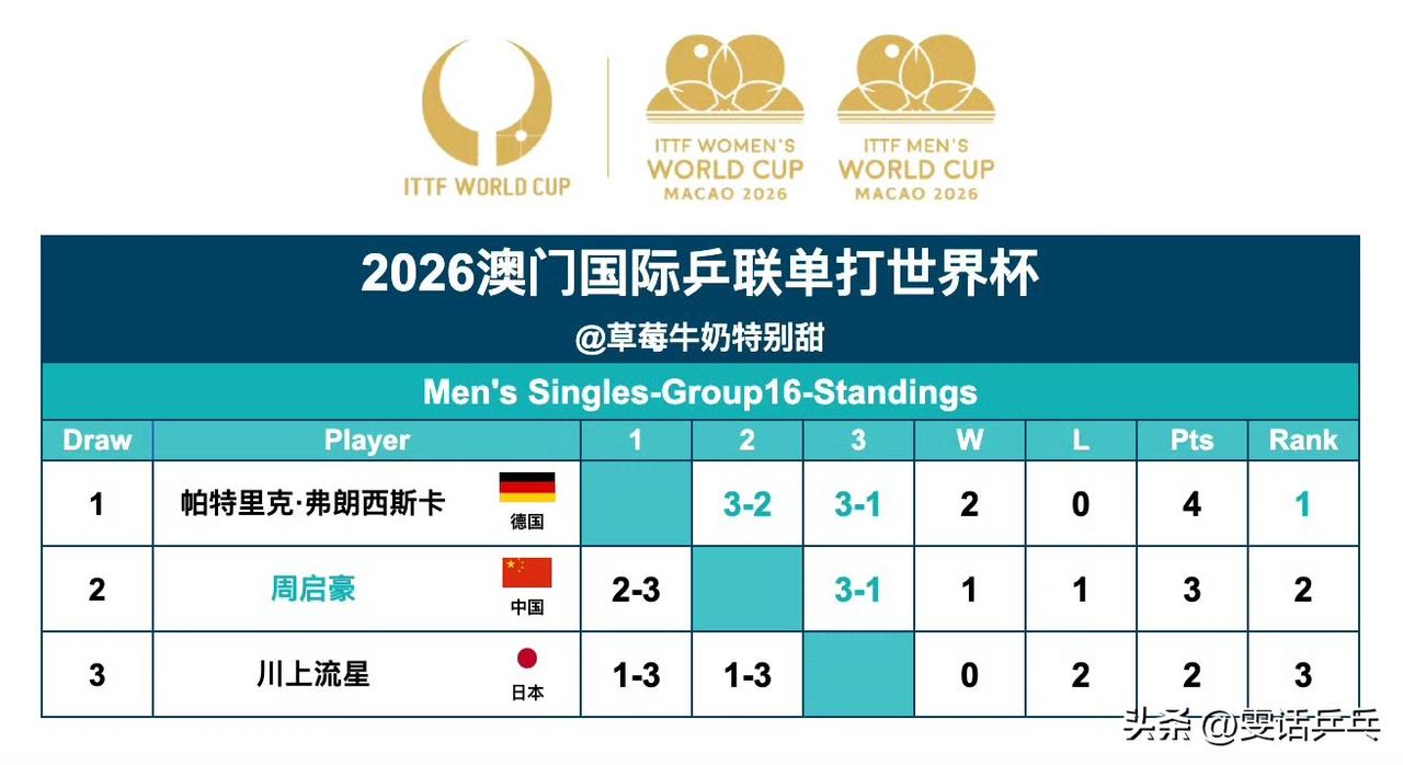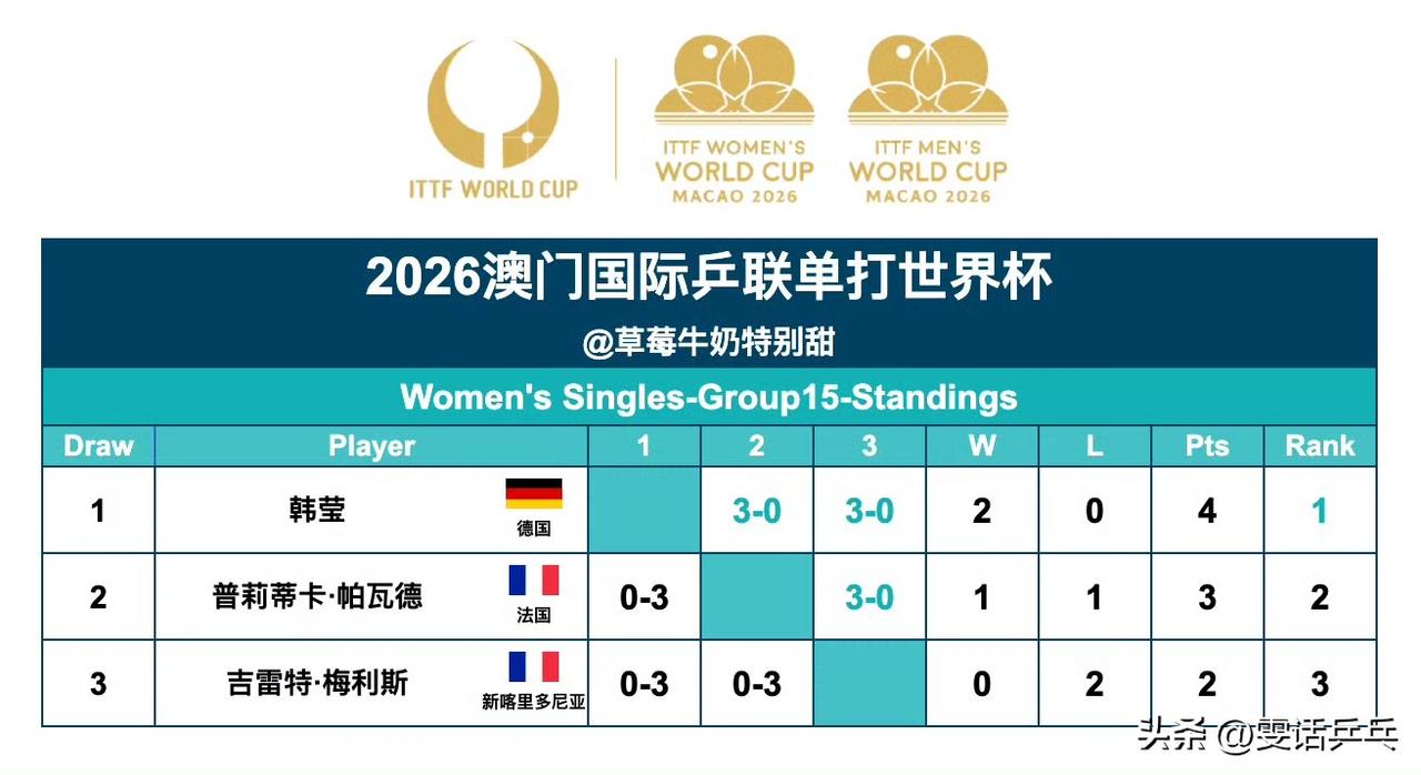 一、女单小组循环赛:4.1 1.韩莹🇩🇪3-0普莉蒂卡·帕瓦德🇫🇷【11-9,11-8,11-6】 2.高桥·布鲁娜🇧🇷3-1伯纳黛特·斯佐科斯🇷🇴【5-11,11-8,11-5,11-5】 二、男单小组循环赛:4.1 1.周启豪🇨🇳2-3帕特里克·弗朗西斯卡🇩🇪【11-6,8-11,6-11,11-2,6-11】 2.梁靖崑🇨🇳2-3迪米特里·奥恰洛夫🇩🇪【11-8,11-6,6-11,9-11,10-12】 注:韩莹、帕特里克·弗朗西斯卡、迪米特里·奥恰洛夫、高桥·布鲁娜晋级第二阶段比赛!