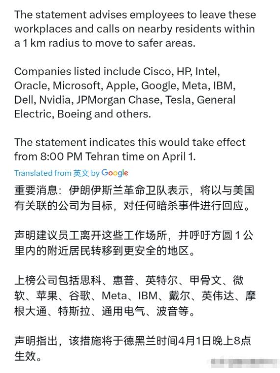 伊朗越打越聪明了,这一招绝对让美国肉疼!   3月31日,伊朗伊斯兰革命卫队发表声明称,伊朗将针对任何暗杀行动作出回应,而伊朗的回应方式是,攻击与美国有关联的企业。   而现在被伊朗点名的企业包括:思科、惠普、英特尔、甲骨文、微软、苹果、谷歌、元宇宙(Meta)、国际商业机器公司(IBM)、戴尔、英伟达、摩根大通、特斯拉、通用电气、波音等公司。   伊朗表示,劝告相关企业员工立即离开工作场所,并呼吁周边1公里范围内的居民转移至安全区域。   伊朗这招是真摸到美国的七寸了,不跟美军硬拼枪炮,专挑美国的“钱袋子”和“技术命门”下手,疼的是美国最不能忍的地方。   波音就不说了,一边拿着美国空军75亿美元的JDAM制导炸弹合同,一边给“爱国者”导弹生产价值27亿美元的导引头,这些装备全是美军在中东作战的关键家伙。   伊朗盯着它打,不是冲着飞机生产线,是要断美军的补给链,让美国再想搞军事行动时,武器装备跟不上趟。   英特尔更特殊,美国政府通过《芯片法案》投了57亿美元,成了它的最大股东之一,表面是被动持股,实则把企业利益和国家战略绑死,打英特尔就是打美国财政的脸。   科技巨头们的角色更关键,伊朗直接点破它们是“美以情报实体”,这话一点没夸张。英伟达的GPU不仅支撑着美国的人工智能发展,还被用于美军的信号处理、 cybersecurity 防御,是现代战争的“大脑核心”。   谷歌、Meta的技术被用来锁定暗杀目标,思科的通信设备是美军中东基地的网络骨干,这些企业早就不是单纯的商业玩家,而是美国全球霸权的技术帮凶。伊朗把它们列为打击目标,等于直接切断美国霸权的技术供血。   更聪明的是,它不用派地面部队,靠导弹和无人机就能精准打击,之前打科威特海水淡化厂、阿联酋铝厂的战绩已经证明,美以的防空系统拦不住也拦不起。   一枚伊朗“沙赫德”无人机成本才2到5万美元,而美国“爱国者”拦截弹一枚就400万美元,1:80的成本交换比,打起来美国先扛不住消耗。   被点名的企业在中东都有大量设施,思科、IBM在沙特有利雅得区域总部,波音在海湾国家有维修基地,这些分散的商业设施比军事基地更难防御,只要击中一个,就能引发连锁反应。   对美国来说,最头疼的是两难选择。要是派兵保护这些企业,就得把有限的军事力量分散到各个商业设施,中东美军本来就兵力紧张,根本顾不过来。   要是不保护,这些企业肯定得撤离,摩根大通、花旗这些金融公司刚在利雅得设了区域总部,特斯拉、谷歌还在推进中东的业务布局,一旦撤离,不仅损失百亿级的投资,还会让美国失去在中东科技和金融领域的话语权。   更要命的是,这些企业的股价已经开始波动,投资者最怕的就是战争风险,持续的威胁会让资本大量撤离,直接冲击美国股市。   伊朗的警告里,让员工撤离、周边居民转移,不是虚张声势,是真的做好了动手准备。之前3月底的反击已经证明,它说打就打,科威特38.5%的供水设施被击穿,阿联酋环球铝业160万吨产能直接归零,以色列化工厂连环爆炸,这些都是实打实的战果。   现在把目标对准美国企业,就是要让美国的商业利益和人命安全挂钩,一旦真发生袭击,美国国内的企业游说集团会立刻给政府施压,比起军事胜利,资本家更怕自己的钱打水漂。   美国的盟友也会跟着慌,沙特、阿联酋这些国家里,美国企业的设施遍地都是,思科、波音的合作项目直接关系到当地的经济发展。   伊朗呼吁周边居民转移,等于把压力转嫁给了这些国家,要是它们不阻止美国的暗杀行动,自己的民生和经济也得受牵连,这就让美国在中东的盟友体系出现裂痕,没人愿意为了美国的利益让自己遭殃。   更关键的是,伊朗这招打破了美国的作战逻辑。美国习惯了用高科技、高成本的武器压垮对手,可伊朗偏偏用“低成本非对称打击”对阵,专挑美国商业设施这种防御薄弱、价值极高的目标。   这些企业的全球供应链一断,影响的不只是美国,还有全球科技和经济秩序,苹果的供应链、摩根大通的金融服务、英伟达的芯片供应,牵一发而动全身,美国想反击都找不到精准目标,总不能因为企业被打就对伊朗全面开战,那样的代价美国根本承受不起。   伊朗还摸准了美国的内部矛盾,这些被点名的企业都是美国的纳税大户,雇佣了数十万员工,一旦设施遭袭、业务停滞,失业、股价暴跌、税收减少会一连串爆发。   美国政府要是不管,国内舆论和资本都会反弹;要是管,又没什么好办法,总不能让企业放弃全球最大的中东市场。这种进退两难的局面,比打一场局部战争更让美国难受。   说到底,伊朗这招不是瞎打,是算准了美国的软肋。美国的霸权靠军事、科技、经济三条腿支撑,这15家企业就是后两条腿的关键节点。不跟美军硬刚,专打商业利益,让美国在“维护霸权”和“保住利益”之间做选择题,而不管怎么选,美国都得肉疼。