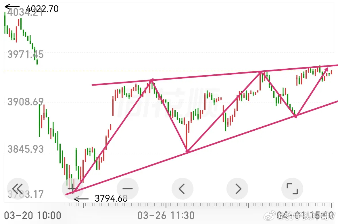 对于这根高开高走的阳线,成色到底如何?可有持续性?目前也是众说纷纭。个人依然以修复性反弹来看待,对此咱们从三个方面来进行探讨。首先,从量价关系来看,全天缩量上涨,多头向上的决心不足。其次,从如图所示运行轨迹来看,指数来到收敛形态末端,上方压制明显,且即将面临方向选择。最后,从时空角度来看,已处在一个短线时空共振窗口。综合以上来看,变盘一触即发,反弹随时告一段落的概率大。