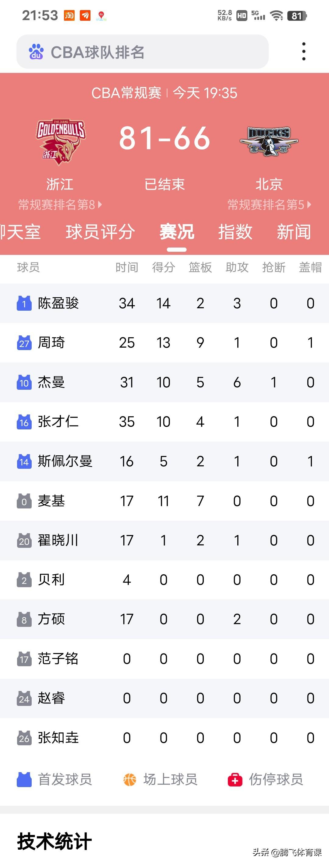 北京客场66:81惨败浙江,不得不承认4大事实: 1.缺少赵睿,北京队整体实力跌一个档次。 2.方硕已34岁能给球队带来的帮助少之又少,仅剩下精神上的支柱。 3.范子铭已彻底板凳坐穿,已连续几场没有机会出场,这份四年的顶薪合同估计让北京队高层肠子都悔青了。 4.北京队继续留下贝利,球队冲击四强岌岌可危,冲冠更不可能了。 有谁会想到:账面阵容豪华的北京队一直游在常规赛四强之外,缺少了赵睿等于球队缺少一个能掌控节奏的指挥官,无论是陈盈骏还是方硕都无法弥补赵睿缺席比赛的留下的影响。