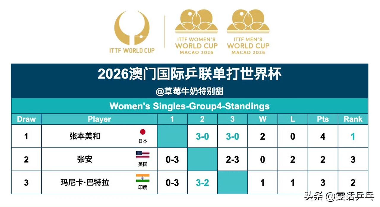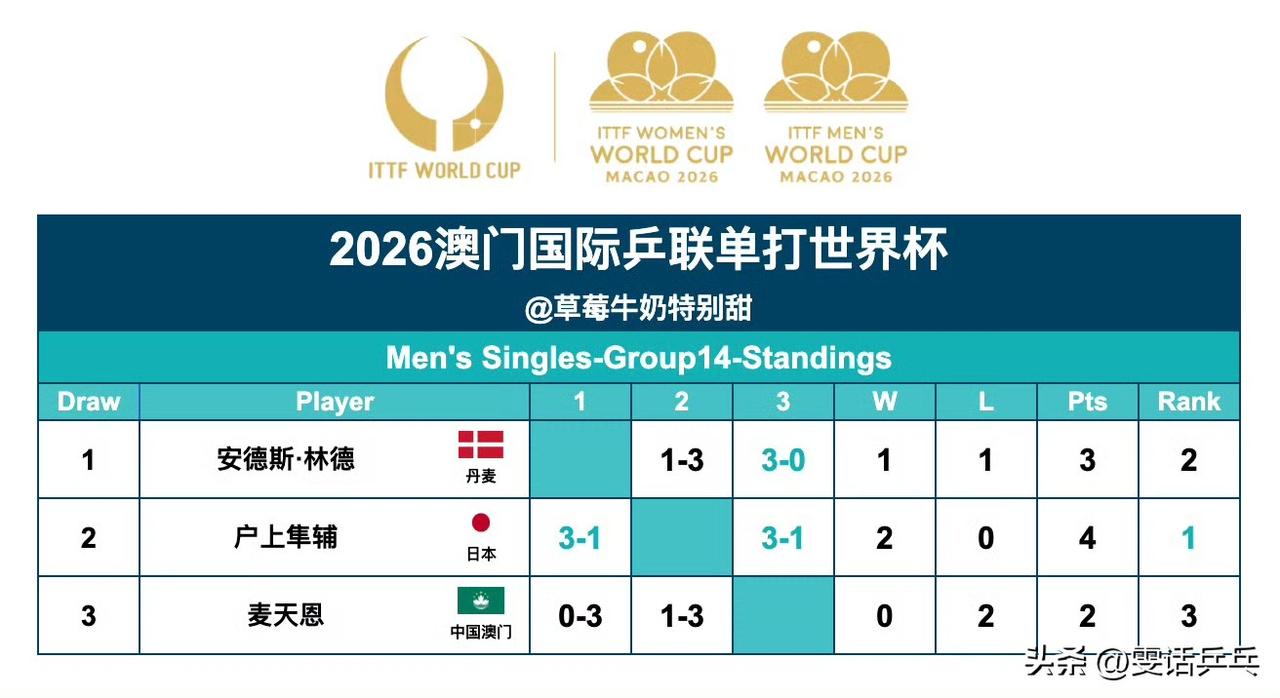 一、男单小组循环赛:4.1 户上隼辅🇯🇵3-1安德斯·林德🇩🇰【9-11,11-2,13-11,11-4】 二、女单小组循环赛:4.1 张本美和🇯🇵3-0张安🇺🇸【11-3,11-4,11-8】 注:户上隼辅、张本美和晋级第二阶段淘汰赛!