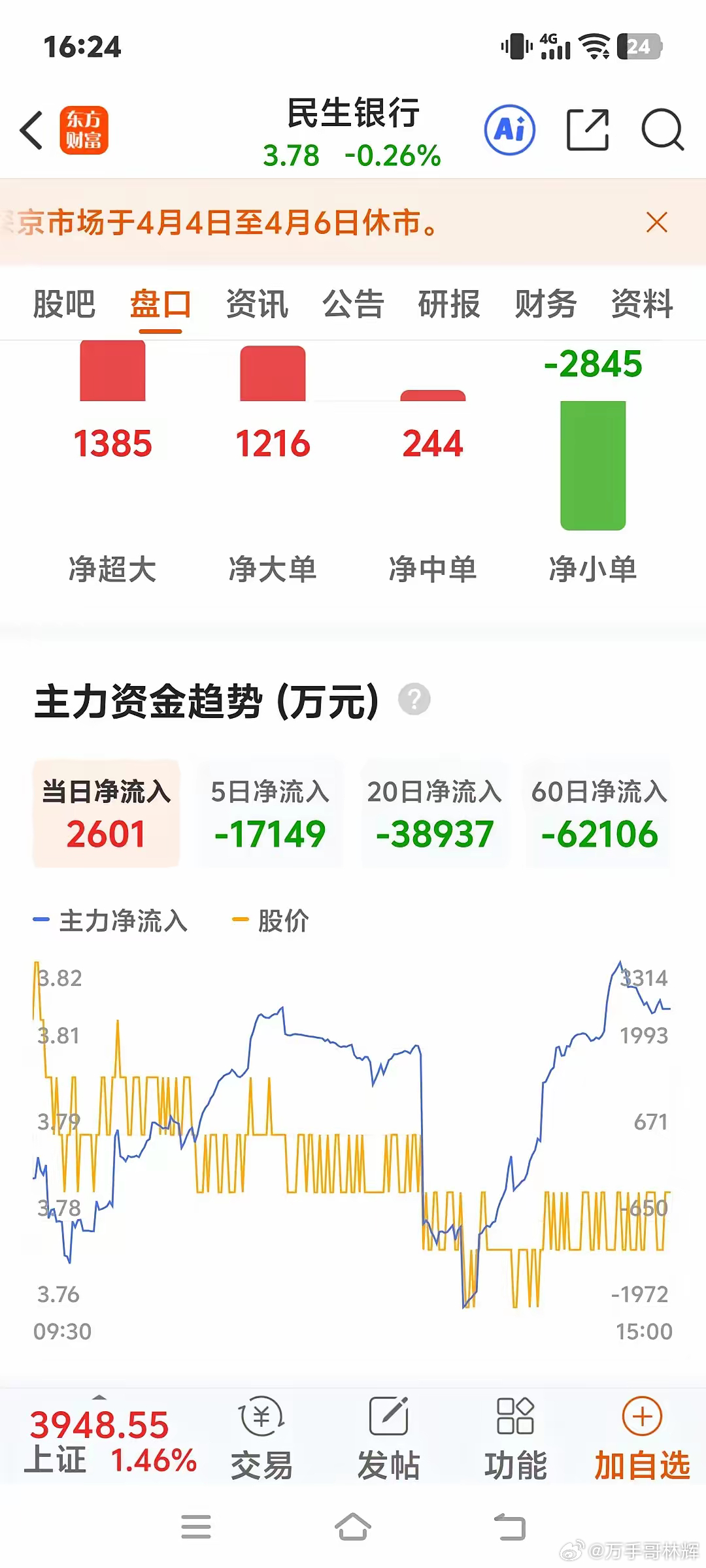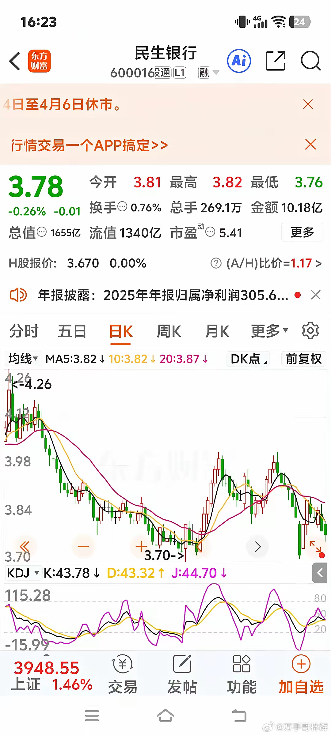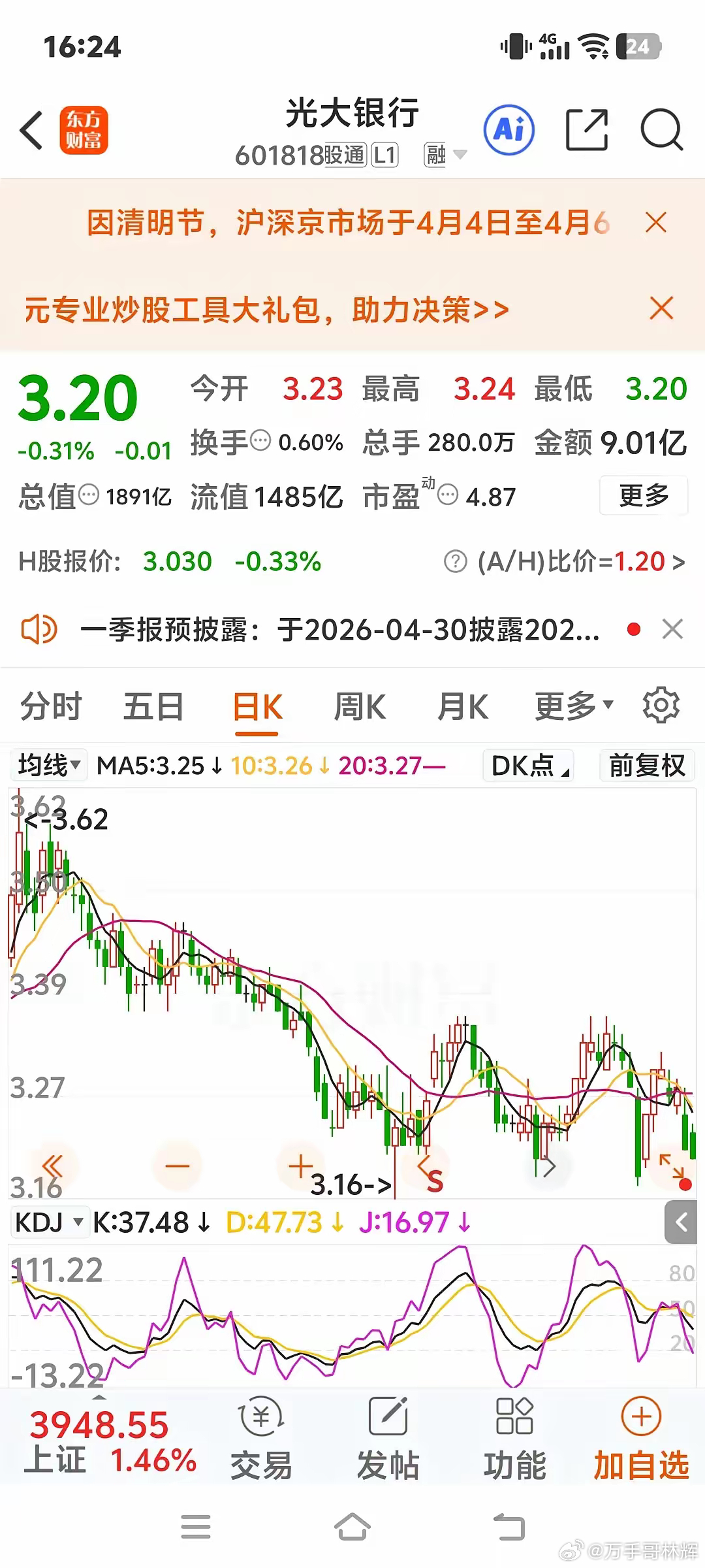 民生银行光大银行今天又创近几天回调下跌新低了,会不会再创2026年下跌新低呢?民生银行今天又下跌了0.01元,收盘价3.78元,盘中低点3.76元比昨天3.79元又低了0.03元,收盘在空头排列的五天均线下方,日线级别KDJ有金钩拐头向下可能,今天买盘90.77万,卖盘178.3万,卖盘比买盘多了不少,主力资金今天流入了2601万,明天该不会再创近几天回调新低了吧?光大银行今天也下跌了0.01元收盘价3.20元,收盘在空头排列的五天均线下方,盘中低点3.20比昨天低点3.21元又低了0.01元,日线级别KDJ死叉向下发散尚未调整到位,今天买盘86.65万,卖盘193.3万,主力资金流出了2307万,明天会不会再创近几天新低?两只银行股会不会再次跌破2026年元月份的新低点呢?欢迎股友们多多留言交流谢谢!喜欢听我聊股市行情的股友,请你先点关注,不迷路,方便以后找到我。谢谢!