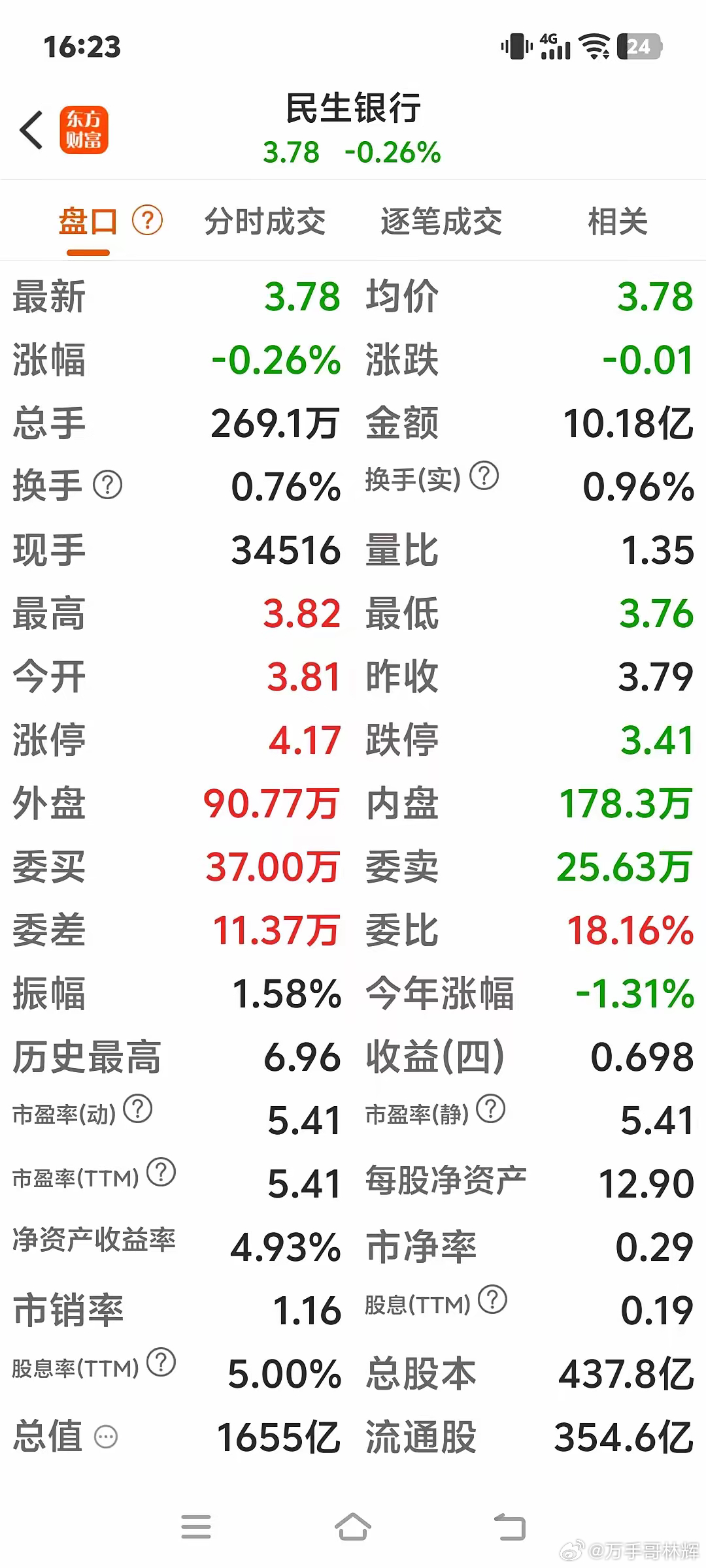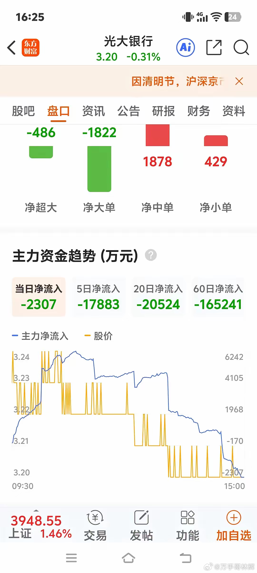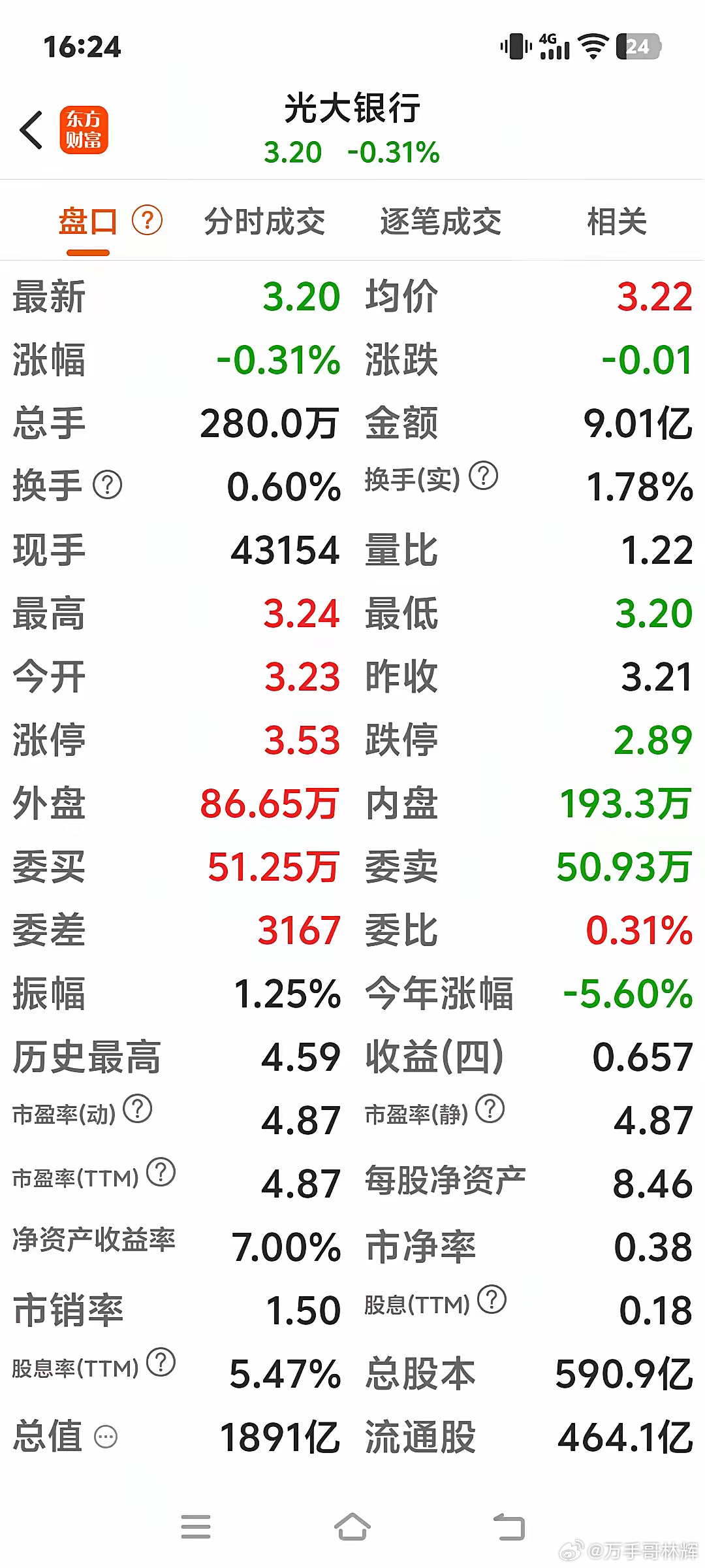 民生银行光大银行今天又创近几天回调下跌新低了,会不会再创2026年下跌新低呢?民生银行今天又下跌了0.01元,收盘价3.78元,盘中低点3.76元比昨天3.79元又低了0.03元,收盘在空头排列的五天均线下方,日线级别KDJ有金钩拐头向下可能,今天买盘90.77万,卖盘178.3万,卖盘比买盘多了不少,主力资金今天流入了2601万,明天该不会再创近几天回调新低了吧?光大银行今天也下跌了0.01元收盘价3.20元,收盘在空头排列的五天均线下方,盘中低点3.20比昨天低点3.21元又低了0.01元,日线级别KDJ死叉向下发散尚未调整到位,今天买盘86.65万,卖盘193.3万,主力资金流出了2307万,明天会不会再创近几天新低?两只银行股会不会再次跌破2026年元月份的新低点呢?欢迎股友们多多留言交流谢谢!喜欢听我聊股市行情的股友,请你先点关注,不迷路,方便以后找到我。谢谢!