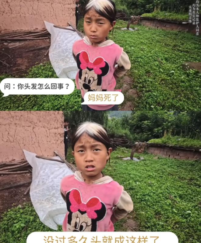 一个10岁左右的女孩,妈妈喝农药死了,伤心过度没过多久头顶头发全白了,采访她的时候眉头一直皱成一团,面容苍老看着比家里的奶奶还要显苍老,这不是天生的少白头,而是妈妈离世后,她日夜伤心,一点点熬白的,网友:真的是太难了! 事情的起因很简单,偏远山村里的一户人家,刚迎来新生儿没几天,母亲却因产后心绪不宁,又被生活琐事压得喘不过气,一时想不开喝下农药,等家人发现时,早已没了气息。 躺在襁褓里的弟弟还在熟睡,10岁的女儿小梅站在一旁,懵懵懂懂间,只知道那个天天抱着她、给她做饭、哄她睡觉的妈妈,再也不会醒过来了。 妈妈的葬礼办得潦草,村里的乡亲们帮忙料理后事,哭声在破旧的土屋里回荡,小梅从那天起就没怎么笑过,也不像从前那样爱跑爱闹,总是一个人缩在墙角,眼睛直勾勾地盯着妈妈生前坐过的板凳、用过的灶台,眼泪无声地往下掉。 白天她不敢大声哭,怕惹得年迈的奶奶更伤心,可到了夜里,躺在冰冷的床上,她总会蒙着被子偷偷抽泣,哭到嗓子发哑、浑身发抖,直到哭累了才昏昏睡去,一开始只是偶尔掉几根头发,她没在意。 后来每天醒来枕头上都会落满青丝,没过多久,头顶的黑发竟一点点泛白,从几缕银丝慢慢蔓延,短短半个月,满头乌黑的头发就全变成了雪白,这不是天生的少白头,是她日夜思念妈妈、被无尽悲伤熬出来的白发。 妈妈走后家里的天彻底塌了,爸爸处理完后事,看着嗷嗷待哺的小儿子、满头白发的女儿和体弱多病的老母亲,觉得日子没了盼头,背着一个破旧的蛇皮袋,说要外出打工挣钱,可这一去就是三年,没有寄过一分钱,没有打过一个电话,彻底消失在了这个家的生活里。 偌大的土屋,只剩下祖孙三人,屋里穷得连一盏像样的电灯都没有,天一黑就只能摸黑做事,墙角堆满杂物,连件干净的家具都找不到,生活的重担,一下子全压在了10岁的小梅身上。 每天天不亮她就得起早生火做饭,先给奶奶盛好饭,再抱着弟弟喂奶、换尿布,接着去院子里喂猪——那是家里唯一值钱的东西,是祖孙仨活下去的指望。 喂完猪,她要挑着水桶去村口的井边打水,小小的身子被水桶压得微微弯曲,走几步就要歇一歇,肩膀上磨出了红红的印子,洗完一家人的衣服,她还要扫地、收拾屋子,忙完这些,又得哄着哭闹的弟弟,陪奶奶说说话,从早到晚没有一刻空闲。 她不敢停下,一闲下来,妈妈的模样就会浮现在眼前,心里的疼就会翻涌上来,只有不停干活,才能暂时忘记那份蚀骨的悲伤,后来有记者找到家里采访,小梅站在奶奶身边,眉头始终紧紧皱成一团,怎么也舒展不开。 那张本该稚嫩的脸庞,没有半分孩童的灵气,眼神空洞又黯淡,皮肤粗糙发黄,看着比头发花白的奶奶还要苍老几分,有人问她想不想妈妈,她只是低着头,攥着衣角,半天说不出一句话,眼泪却顺着脸颊往下淌,滴在雪白的头发上,又慢慢滑落。 她从不说自己有多苦,也从不抱怨爸爸的离去,只是默默扛着一切,那一头白发,就像一道深深的伤疤,刻着她童年所有的伤痛与思念,村里的乡亲们看着心疼,偶尔会送些米面、旧衣服过来,可再多的帮助,也弥补不了她失去的母爱,也唤不回她那头乌黑的头发。 如今的小梅依旧每天重复着繁重的活计,照顾奶奶和弟弟,只是那紧锁的眉头、苍老的面容和满头的白发,时刻都在诉说着一个10岁女孩,在失去妈妈后,所经历的无人知晓的煎熬与心碎。 她的童年,被一场突如其来的悲剧彻底碾碎,那些本该无忧无虑的时光,全都化作了日夜的泪水与满头的白发,成了一辈子都抹不去的印记。
