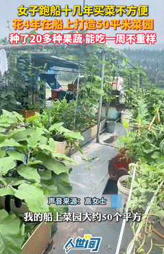 女子跑船吃不到新鲜蔬菜,竟在船上打造一个50㎡菜园!如今不仅能一周蔬菜不重样,还成功种出了西瓜和甜瓜!网友调侃:中国人都有种菜基因这件事彻底解释不清了...... 事情的起因很简单,广东的高女士在珠三角内河跑船十几年,常年跟着货船漂泊在水面上,每次出航少则一周、多则十来天才能靠岸一次,船上生活条件简陋,物资补给不便。 最让人难熬的就是吃不上一口新鲜蔬菜,大多时候只能靠冷冻菜、罐头和方便面对付,几天不吃肉没什么,可连续吃不到鲜灵的青菜,整个人都觉得没精神,嘴里也总是寡淡无味。 看着船顶那片闲置的空地,平时只用来晾衣服、堆杂物,四年前她突然萌生了一个念头——把这片空地改成菜园,自己动手种蔬菜,解决跑船吃菜难的问题。 说干就干,高女士把船尾生活区顶部和驾驶楼顶的空地收拾出来,拢共约50平方米的空间,成了她的“海上菜园”,可船上种菜远没有岸上那么容易。 一开始她完全是门外汉,走了不少弯路,船顶风大、日照毒辣,普通的泥土一晒就板结开裂,刚撒下去的种子要么被风吹走,要么在高温下发不了芽,最难的还是解决土壤和水肥问题。 船上不能就地取土,每一袋土都得靠岸时从岸上一点点搬上来,一次装卸货的间隙,别人都忙着补给燃油、生活用品,她就四处找土、搬土,一趟趟往船上运,肥料也没法外购,只能平时把淘米水、剩菜剩饭积攒起来发酵,慢慢摸索自制有机肥。 浇水更是要精打细算,靠着内河丰富的淡水,一点点浇灌菜苗, 她没有轻易放弃,不懂种植技巧就上网搜教程、查资料,遇到有经验的老船员就主动请教,一点点积累船上种菜的经验。 从选种开始,她专门挑耐风、耐旱、生长周期短的蔬菜品种,先从容易成活的空心菜、生菜、油麦菜等叶菜试起,慢慢再尝试辣椒、茄子、番茄等瓜果菜。 为了防止土壤板结,她特意改良土质,混合木屑、椰糠增加疏松度,还在菜地边缘搭起简易的挡风小围栏,减少大风对菜苗的侵害,日复一日的摸索和打理,这片原本光秃秃的船顶空地,渐渐有了绿意,菜苗从稀稀拉拉到茁壮成长,从几样蔬菜到种类越来越丰富。 四年时间过去高女士的50平方米船上菜园早已打理得有声有色,如今里面种满了二十多种应季果蔬,叶菜类的生菜、油麦菜、小白菜、西洋菜四季轮换,瓜豆类的黄瓜、丝瓜、豆角、苦瓜爬满藤架,还有辣椒、茄子、番茄、韭菜、香菜等,品种多到一周吃菜都能不重样。 更让人惊喜的是她还成功种出了西瓜和甜瓜,虽然船上种的瓜个头比岸上的小一些,但甜度一点也不差,口感清甜爽口,每到丰收时节,船顶一片郁郁葱葱,翠绿的菜叶、鲜艳的瓜果点缀在灰色的船体上,成了水面上一道特别的风景。 现在的高女士再也不用为吃不上新鲜蔬菜发愁,每天做饭时,随手就能从船顶摘下最新鲜的食材,炒出喷香的家常菜,吃不完的蔬菜,她还会大方分享给同行的其他船员,遇到熟悉的货船靠过来,送两把青菜、递半个西瓜,小小的菜园不仅解决了自己的吃菜问题,还拉近了跑船人之间的距离。 这件事被分享到网上后,很快引来众多网友关注,大家纷纷点赞感叹,有人调侃说,中国人刻在骨子里的种菜基因果然藏不住,不管是陆地还是船上,只要有空间、有土壤,就能变出一片菜园。 对高女士来说,这片小小的船上菜园,不仅是解决伙食的地方,更是她在漂泊跑船生活里,亲手打造的一方温暖天地,藏着普通人对生活的热爱与用心。