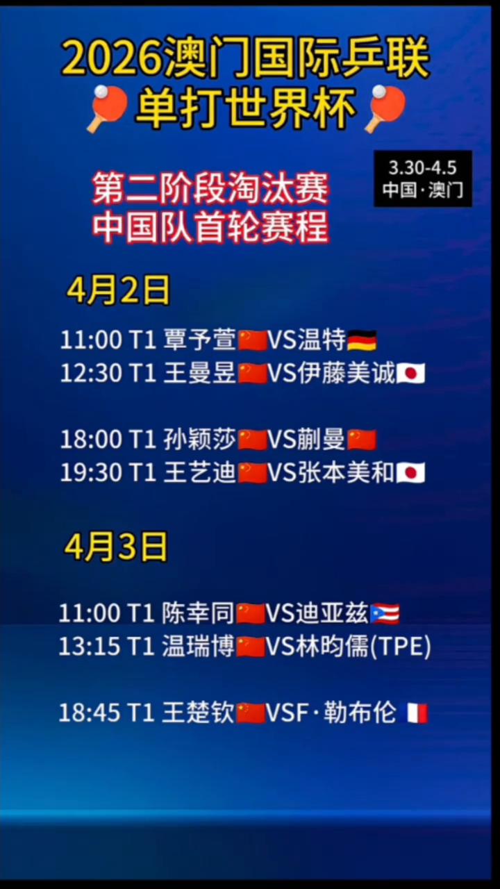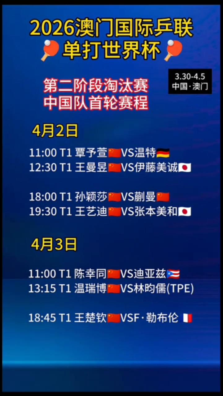 2026澳门国际乒联单打世界杯第二阶段淘汰赛中国队首轮赛程。 ·4月2日:11:00T1覃予萱VS温特。 ·4月2日:12:30T1王曼昱VS伊藤美诚。 ·4月2日:18:00T1孙颖莎VS蒯曼。 ·4月3日:19:30T1王艺迪VS张本美和。 ·4月4日:11:00T1陈幸同VS迪亚兹。 ·4月5日:13:15T1温瑞博VS林昀儒(TPE)。 ·4月6日:18:45T1王楚钦VSF·勒布伦。 ·4月7日:12:30T1王曼昱VS伊藤美诚。
