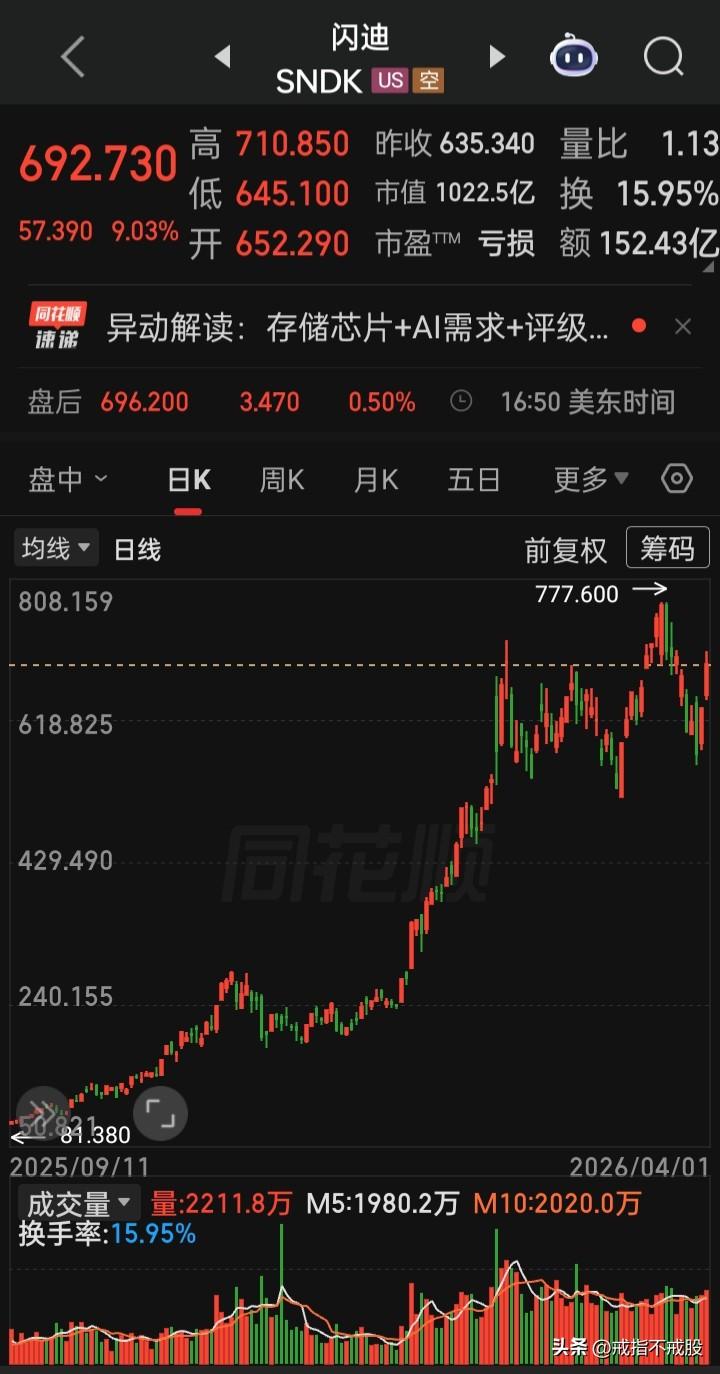 【2026.04.01】美以对伊战火持续第天33中,美三大指齐高开震荡,收盘齐涨,“七姐妹”涨跌不一,“铝业、固态硬盘、激光雷达、金属与采矿、建筑与工程、半导体产品与设备”等板块概念涨幅在前,“谷歌A”涨3.42%,“礼来”涨3.75%,““超微半导体”涨3.33%,“美光科技”涨8.88%,“闪迪”涨9.03%,“英特尔”涨8.84%,“希捷科技”涨8.00%,“西部数据”涨10.07%,“波音”涨4.20%,“脑再生科技”涨32.60%,“稳定币第一股ICircle”5.04%,“Swarmer(无人机技术)”跌2.54%,“纳指金龙中国”高开震荡,涨0.31%,“阿里巴巴”1647%,“36氟”跌5.83%,“尉来”涨2.74%,“理想汽车”涨3.08%,“海川证券”涨14.62%,“九洲大药房”跌15.15%,三大美指,美元、离岸人民币、黄金、白银、原油涨跌幅表现 【道指】 收46565.74,涨0.48% 【纳指】 收21840.95,涨1.16% 【标普】 收6575.32, 涨0.72% 【美元指数】 目前报99.5510,跌0.41% 【离岸人民币】目前报6.87816,跌0.15% 【纽约金主连】目前报4786.2,涨2.30% 【纽约银主连】目前报75.320,涨0.54% 【美原油主连】目前报99.05, 跌2.30%