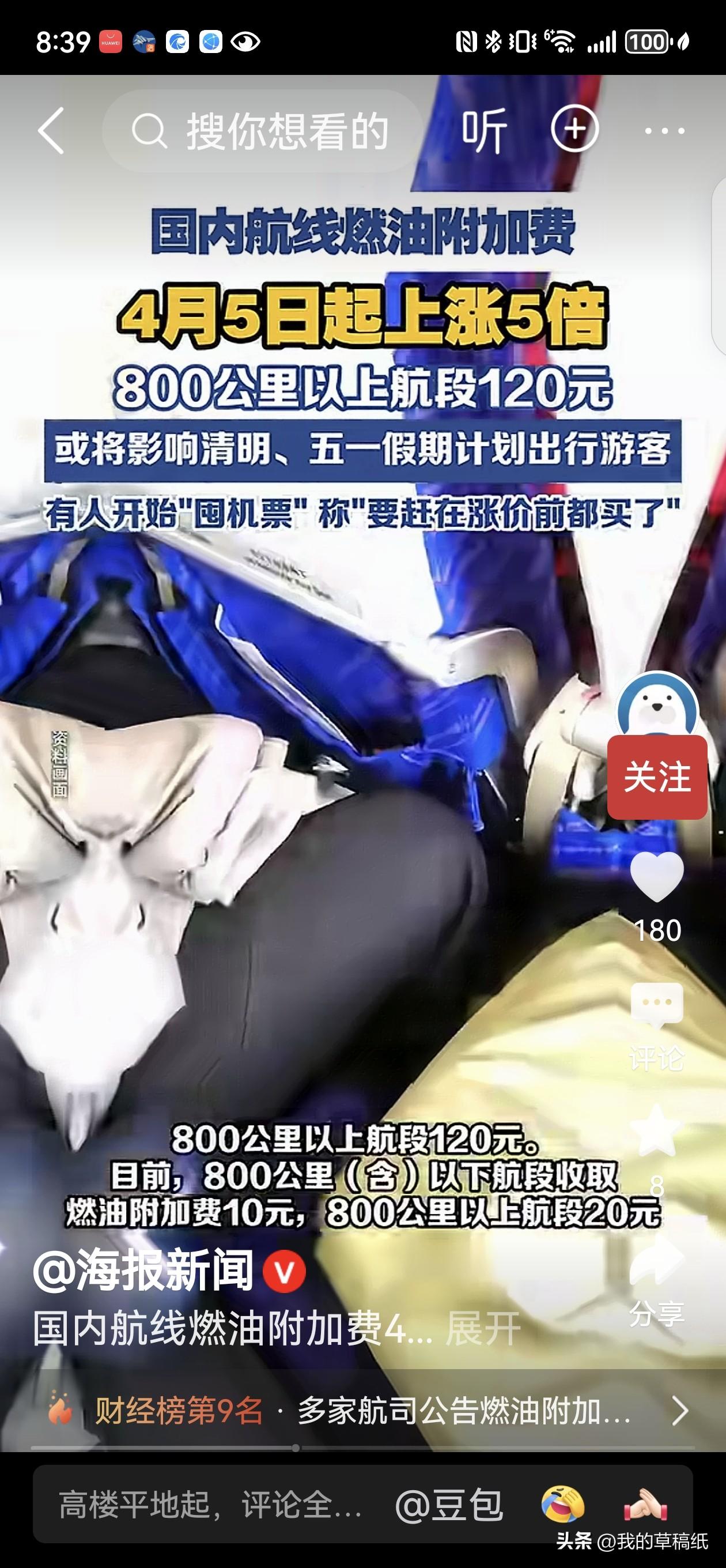 紧急提醒!4月5日起坐飞机多花上百,燃油费直接涨5倍! 刚官宣!4月5日起国内航线燃油附加费大幅上调,短途从10元飙到60元,长途从20元涨到120元,直接涨5倍,五一出行成本又要增加! 这次涨价以出票时间为准,4月5日前买好票不受影响。换算下来,短途往返多花100元,长途往返直接多花200元,一家三口出行光燃油费就要多掏大几百。 核心原因很简单:国际油价持续走高,航司燃油成本压力陡增,只能通过附加费传导。虽然票价没涨,但这笔固定支出实打实加重负担,对清明、五一出行的朋友太不友好。 提醒大家:刚需出行尽量提前锁票,避开涨价节点;能错峰就错峰,能高铁替代就选高铁。 你五一打算坐飞机还是高铁?评论区聊聊怎么出行更划算! 民航附加费上调