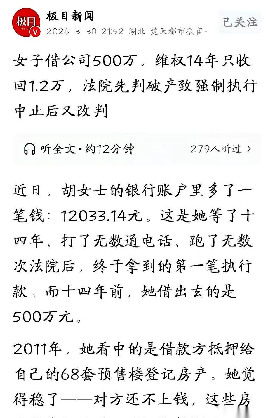 黑纸白字的合同,法院盖章的判决书,外加68套房子“托底”,黑龙江大庆的胡女士把500万身家押进去,14年后,银行账户里只多了一万二。 最狠的不是赖账,而是对方的玩法。 2011年,一个地产老板找到胡女士,说有个大项目,就差500万启动资金。老板手一挥,许诺得干净利落:“四个月,本金加20万利息,一分不少。” 胡女士也不是新手,她问:“万一呢?” 对方笑了,直接甩出底牌:“万一还不上,公司68套现房,直接过户给你。合同里写得清清楚楚。” 这简直不是借钱,是送钱。胡女士的笔很快就签了下去,公章的红泥印得又深又清晰。 四个月,像一阵风刮过。别说20万利息,500万本金也没影儿。电话里,对方总是那几句“快了快了,资金马上到位”。 一年后,胡女士懒得再听了,直接一张状纸递上法庭。 有合同在,她赢得毫无悬念。判决书下来,白纸黑字写着:立刻还钱,否则,强制执行那68套房产。 胡女士攥着判决书,觉得石头终于落了地。 可她等来的不是法院的执行电话,而是一记闷棍。对方公司,被另一个债主申请破产了。法院受理了,直接宣告公司进入破产清算。 这一步棋,直接把胡女士的判决书变成了废纸。法律规定,公司一旦破产,所有欠款都得排队,之前的一切强制执行全部中止。那68套房子,不再是她的“专属抵押品”,而是进了所有债主的“大锅饭”里。 胡女士这才反应过来,对方根本不是在“拖”,而是在“做局”。 她反手一查,一个更惊人的事实浮出水面:这家公司,早在跟她借钱的2011年,营业执照就已经被吊销了! 一个“已死亡”的公司,用一个根本没法兑现的“抵押”,卷走了她全部身家。 这口气,她咽不下。 官司从2014年一直磨到2022年,事情突然有了转机——法院撤销了那家公司的破产裁定。 胡女士立刻冲去申请恢复强制执行,她想,这回总该轮到我了吧? 结果,工作人员调出档案,平静地告诉她,那68套房子,在公司“破产”的这些年里,已经悄悄卖掉了61套。 她赢回了打官司的资格,却永远失去了打赢的筹码。 最后一纸裁定,是又等了两年才下来的。法院从那家早已空壳的公司账户里,划出了仅剩的一万两千块钱,打到了胡女士的卡上。 500万,14年,一万二。 这已经不是一个简单的欠债故事了,这是一个教科书级别的案例,教你怎么用规则,把一张盖着公章的法院判决书,变成一张擦桌子都嫌硬的废纸。