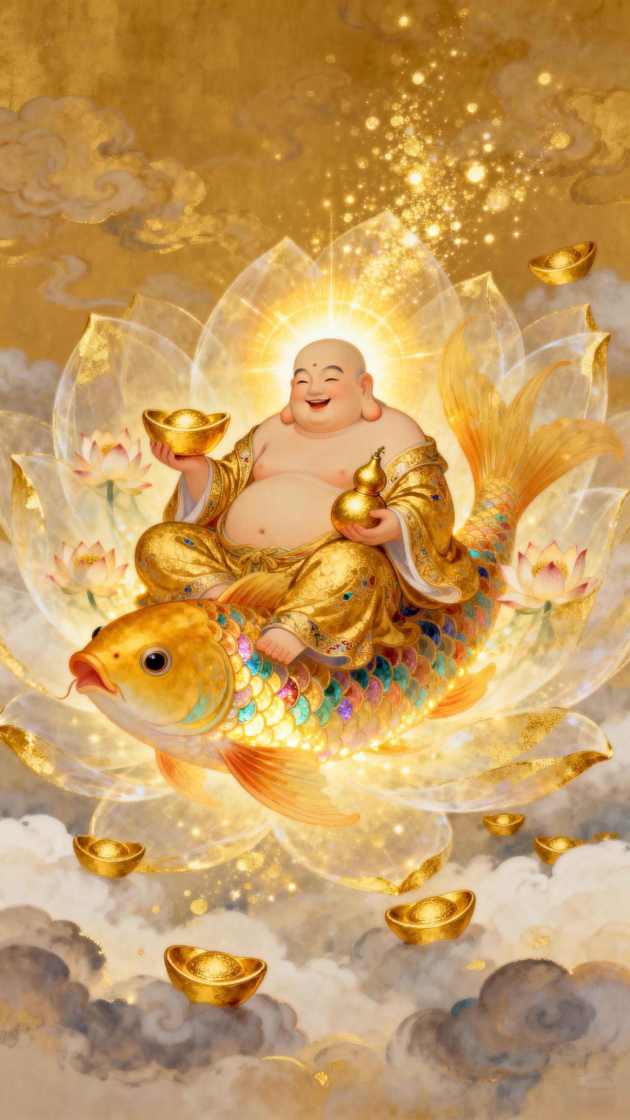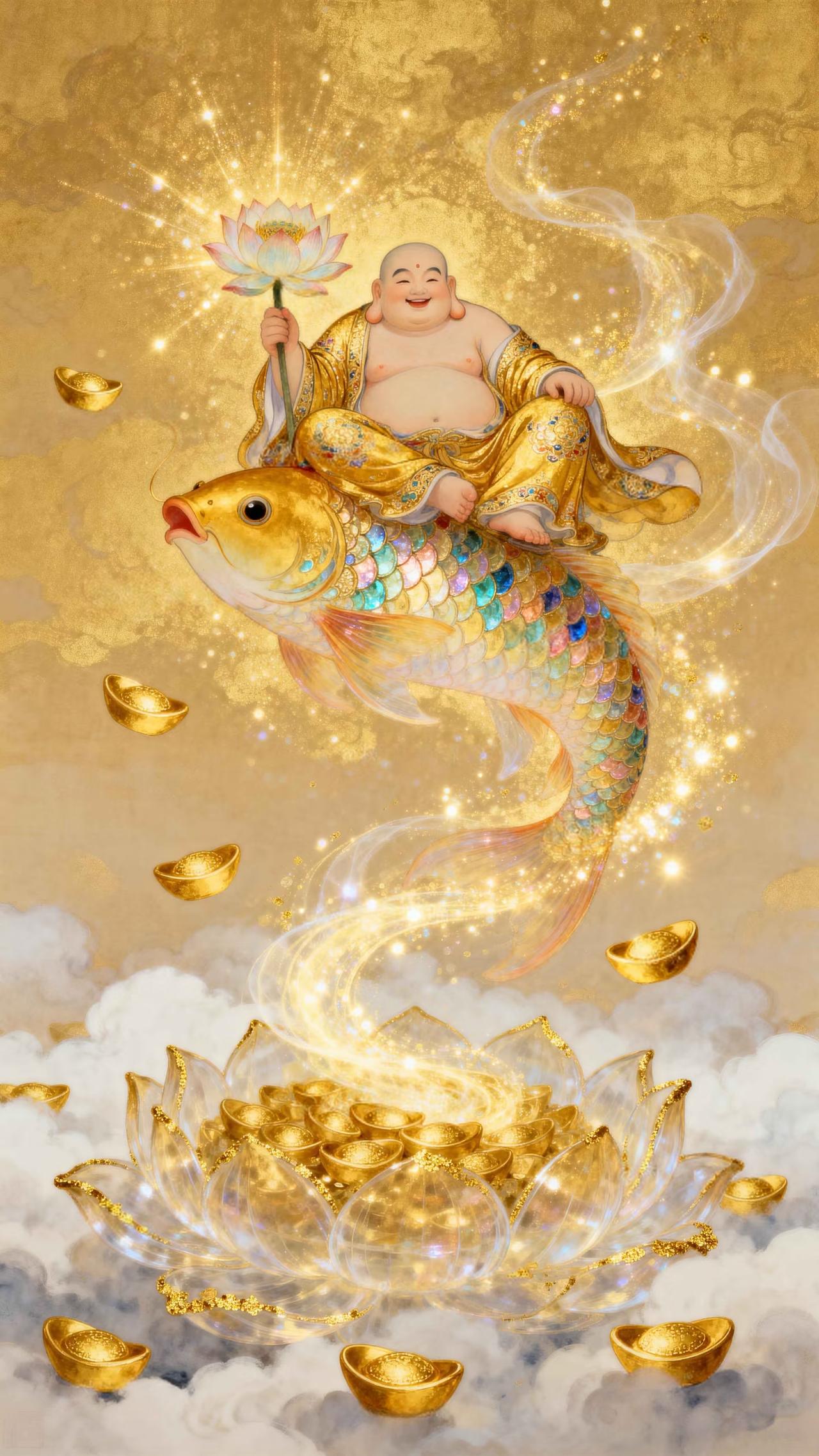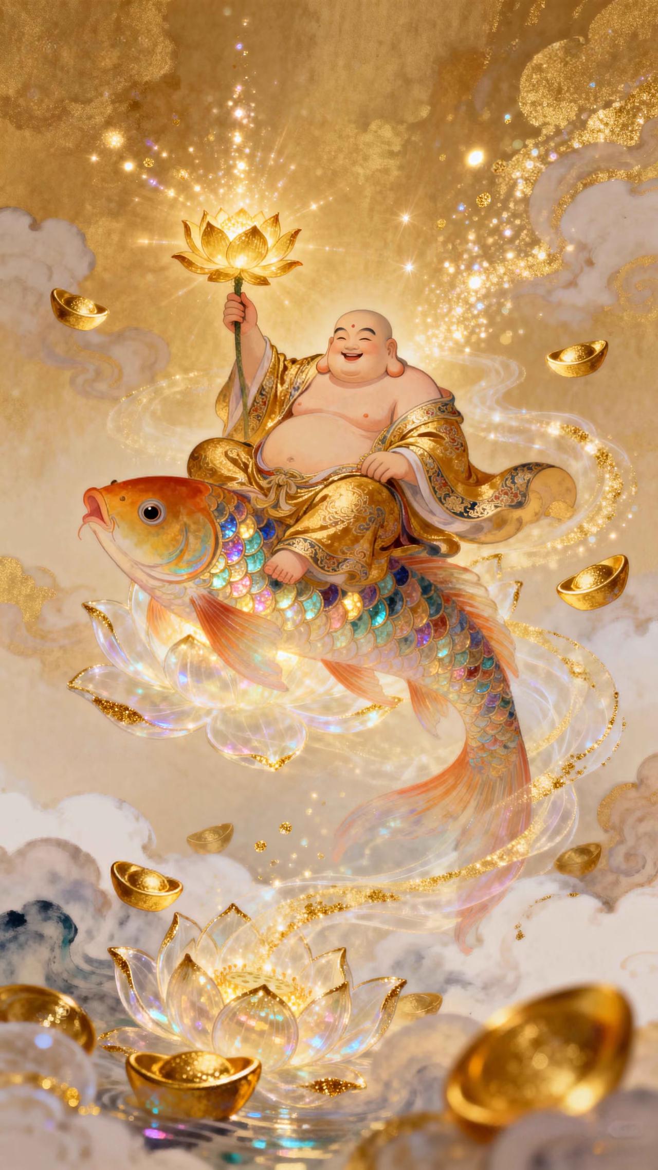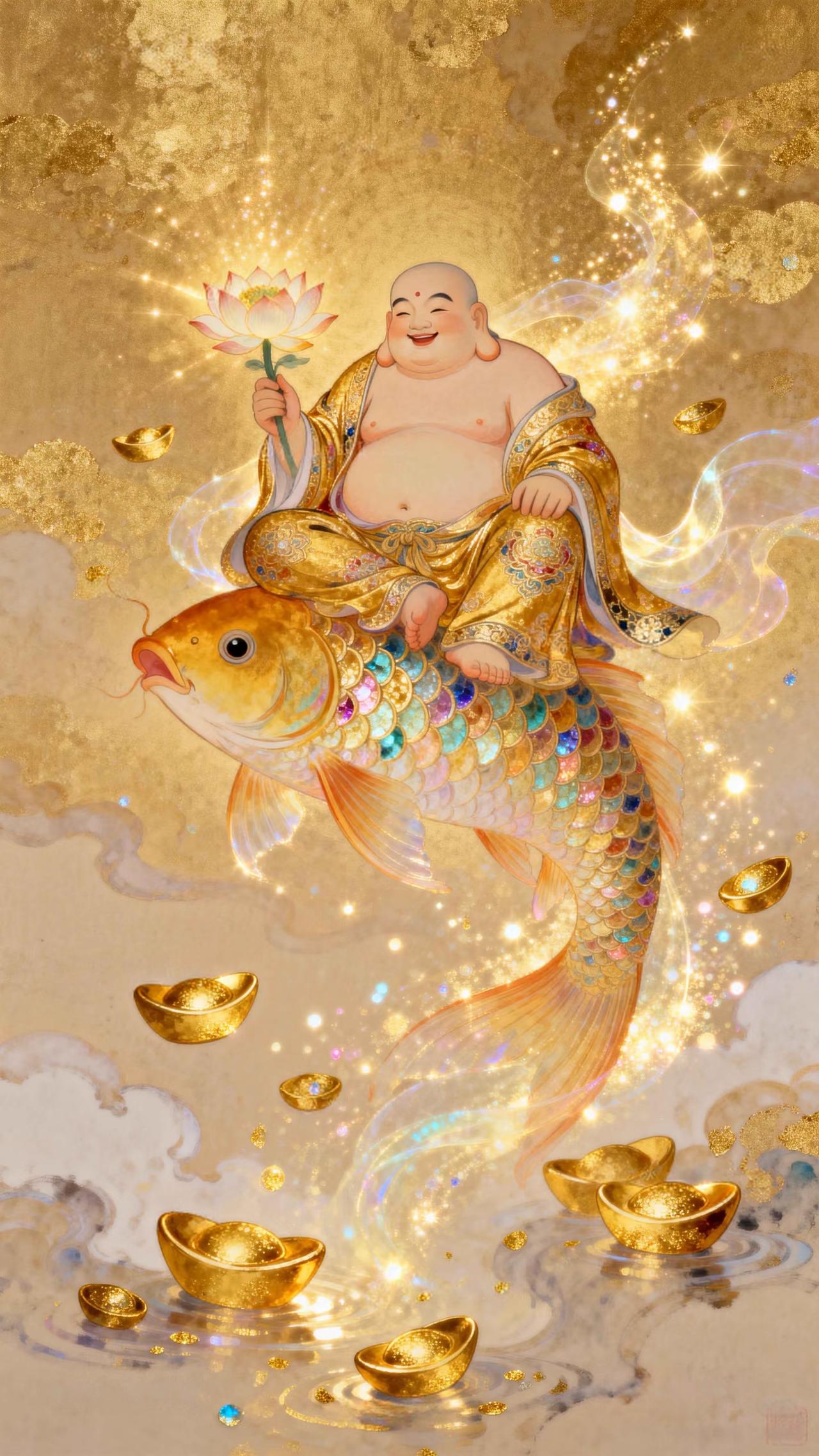 弥勒笑纳乾坤福,金鲤驮来富贵财 传统文化 绘画 祝福
