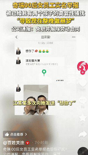 “这下全网都知道了!”安徽芜湖,奇瑞商用车00后女员工控诉,被公司45岁高管多次性骚扰,整夜做噩梦,需要吃药才能入睡。除此之外,还有其他女同事也遭到类似的骚扰,目前已被公司免职处理,解除劳动合同。 4月1日,奇瑞商用车一00后女员工举报遭遇职场性骚扰的材料在网上热议!我们来看看是怎么回事? 龚女士是一位00后女生,在公司的生态事业部工作,是外聘员工,工作半年多。而江某某是公司的高管,45岁,已婚有小孩。 龚女士称,今年1月2日,公司45岁高管江某某给她发消息“想你了”,以及暧昧的表情等。晚上10点半,再次发消息说“想死你了”并配上拥抱的表情包等 。 00后的龚女士没有搭理他,3日凌晨1点半的时候,江某某又发送暧昧信息,甚至凌晨2点的时候打电话骚扰! 而这一切还得回到春节假期结束,回公司上班时说起。到公司上班后,龚女士被江某某叫进办公室,江某捏她的耳朵,摸她的脸,她立马挣脱! 根据举报信信息,江某某还对其他女同事有过类似的骚扰。要求女同事给他刮胡子,还有被摸屁股的。 我们来说说,这样一个大公司的高管应该是品行端正的,爱护下属的,是一个有素养的人才对的,怎么就成了在职场上滥用权力,性骚扰下属,欺负下属呢? 这下好了,不仅全网知道了他干的丑事,看他怎么跟他老婆交代。人家女员工还是个00后呢,他都45岁了,还去性骚扰人家小女生! 网友:这不仅仅是职场性骚扰行为,这可能已经触犯法律了!可以直接报警处理了! 还有网友表示:应该要赔偿当事人的损失。 真是不敢相信,按年龄来说,45岁都可以当00后孩子的父亲了,这事是怎么敢做出来的,一点羞耻感都没有的。换句话说,如果人家女孩子家人,父亲知道会原谅你? 大家对此事有什么看法和建议呢?职场性骚扰何时休? 职场 奇瑞00后女员工实名举报高管性骚扰 00后 奇瑞汽车 奇瑞 信息来源:百姓关注