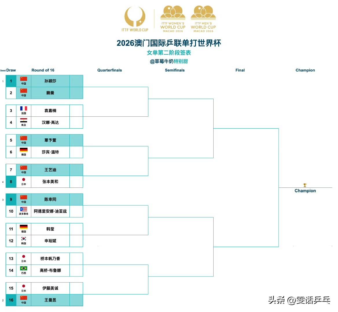 截至4.1晚,女单小组循环赛全部结束,16位选手晋级第二阶段,比赛名单公布如下: 【1/4区】孙颖莎🇨🇳VS蒯曼🇨🇳、袁嘉楠🇫🇷VS汉娜·高达🇪🇬 【2/4区】覃予萱🇨🇳VS莎宾·温特🇩🇪、王艺迪🇨🇳VS张本美和🇯🇵 【3/4区】陈幸同🇨🇳VS阿德里安娜·迪亚兹🇵🇷、韩莹🇩🇪VS申裕斌🇰🇷 【4/4区】桥本帆乃香🇯🇵VS高桥·布鲁娜🇧🇷、伊藤美诚🇯🇵VS王曼昱🇨🇳 2026.4.1