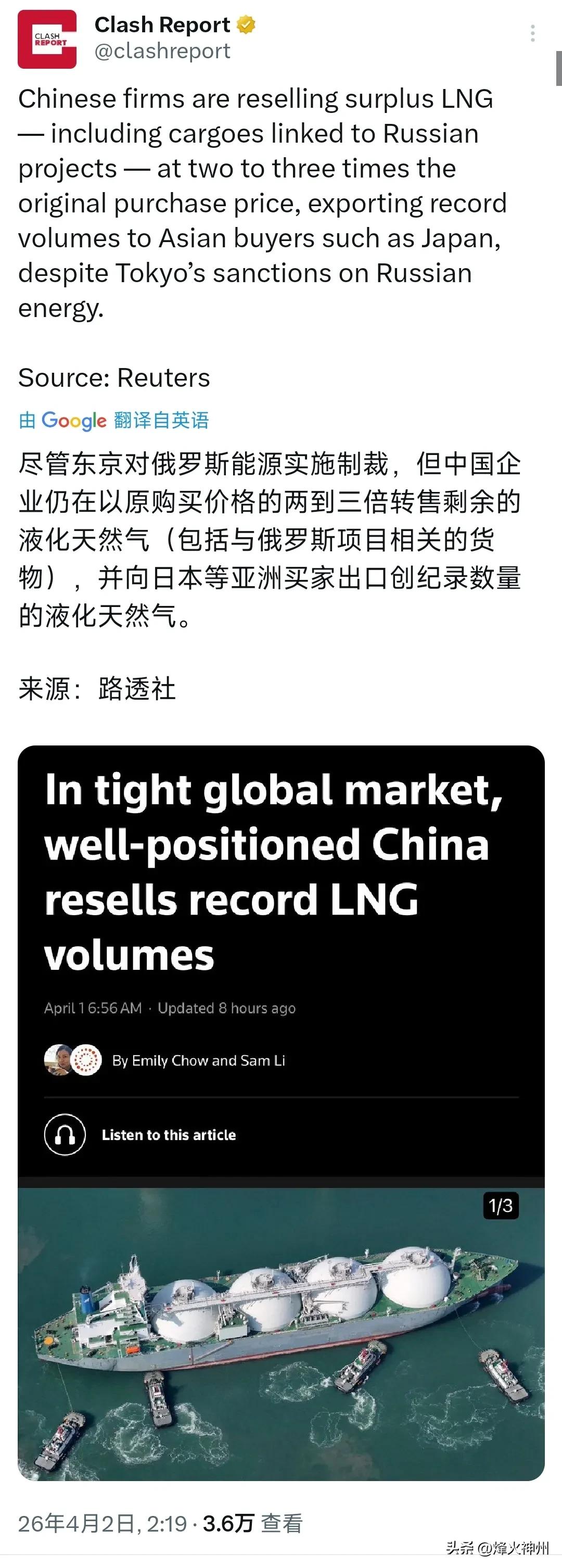 中国企业正在以原购价的两到三倍的价格转售过剩的液化天然气(其中包括与俄罗斯项目相关的货物),并向包括日本在内的亚洲买家出口创纪录数量的天然气,尽管东京方面对俄罗斯能源实施了制裁。来源:路透社 评几句: 路透社披露,日本虽高调制裁俄罗斯能源,却不得不从中国企业手中,以原价两至三倍的价格大量进口含俄气源的液化天然气,相关出口量更是创下纪录。这场荒诞的交易,将西方制裁的虚伪与日本的窘迫彻底暴露在世人面前。 日本紧跟美国推行单边制裁,摆出强硬反俄姿态,实则是典型的政治作秀。国内能源短缺、民生用气紧张的现实,让其所谓的制裁沦为空谈,只能以天价成本曲线购买俄气,既坑害本国民众利益,又沦为国际社会的笑柄。 中国企业遵循市场规则合理调配气源,在合法合规的前提下实现商业收益,这是对西方霸权式制裁的有力回击。能源流通自有其市场规律,任何人为设置的壁垒与政治操弄,在真实需求面前都不堪一击。 日本这种嘴上强硬、身体诚实的双标行径,不仅让制裁彻底失效,更凸显出G7集团的自私与短视。违背市场逻辑的制裁终将反噬自身,而互利共赢的经贸往来,才是不可阻挡的时代大势。