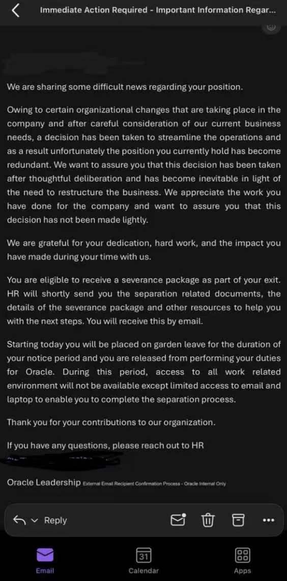 大刀阔斧凌晨甲骨文公司一夜裁员6万人,在凌晨6点通过邮寄方式发送辞退通知和补偿协议几乎在邮件送达的同一时间,不少员工的内部系统权限被立刻收回,甲骨文3万人被“一键辞退”,波及美国、印度等多个地区。 只要补偿合规,随时让你走没有任何问题,你不能因为在这个工作就要赖着一辈子。这便是文明社会的体现,没有尔虞我诈,没有调岗降薪,没有撕扯吵闹,有的是一视同仁,有的是一别两宽,有的是秩序井然 但是国外是按周补偿,而且只有少几个州把裁员补偿写进法律的,其他都是看企业良心了。亚马逊工作6个月补偿一周,最低四周,最高20周,如果这些精英们没有存钱的习惯或者按揭买房买车,能估计得又多了几万流浪汉了。