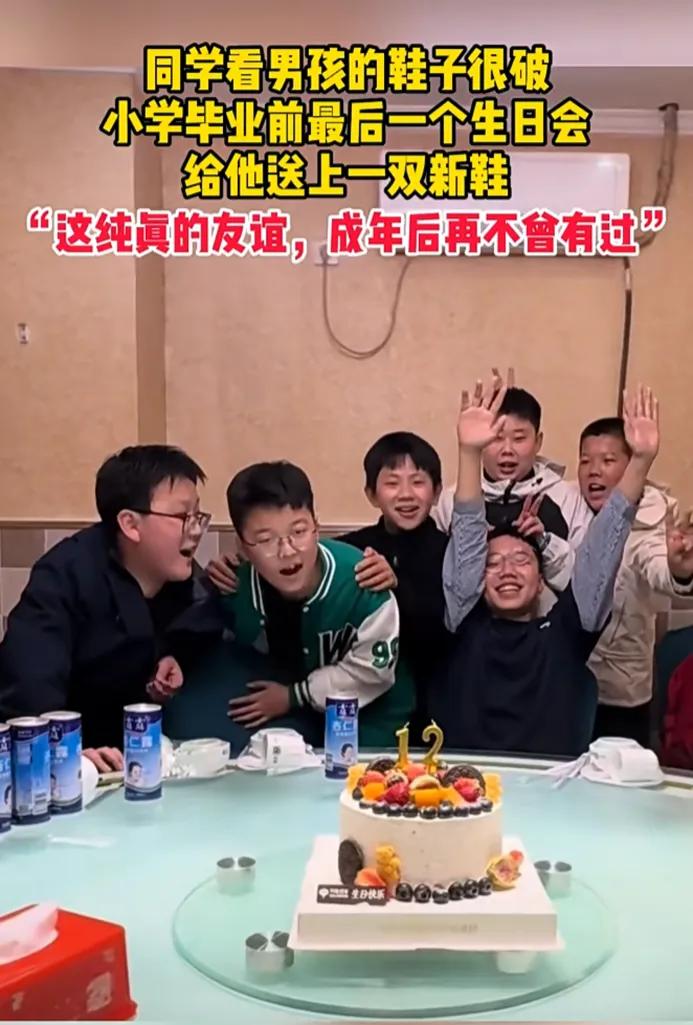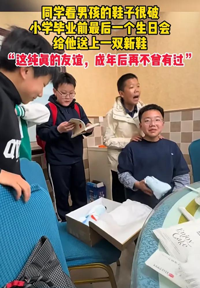 破防了!同学看男孩的鞋很破,在小学毕业前最后一个生日会,送了他意想不到的礼物... 镜头一开始,男孩安安静静坐在椅子上,手里捧着同学递过来的鞋盒,小心翼翼拆开包装,拿出那双崭新的运动鞋时,眼睛瞬间就亮了,嘴角压都压不住,连说话都带着藏不住的开心。旁边的小伙伴们围在他身边,有人拿着本子认认真真念着给好朋友的生日祝福,有人轻轻拍着他的肩膀笑,有人凑在旁边一脸期待地等他反应,每一张脸上都是毫无杂质的真诚。 没人知道这群孩子为了这份礼物,悄悄做了多少事。他们肯定早就注意到,朝夕相处的好朋友,脚上的鞋子已经磨得鞋底变薄、鞋边开胶,却从来没在同学面前抱怨过一句。他们没把这件事当成笑话,也没在大庭广众下戳破对方的窘迫,而是悄悄凑在一起商量,用自己攒了好久的零花钱,一起选了一双好看又合脚的新鞋,就等着在小学毕业前最后一个生日会上,当成最郑重的礼物送出去。 没有攀比,没有炫耀,就是纯粹的、想让好朋友开心的心意。送礼物的时候,他们没有刻意强调“看你鞋破了给你买的”,只是当成一份普通的生日惊喜,给足了男孩所有的体面。 其实长大之后,我们好像再也很难拥有这样的友谊了。成年人的世界里,送礼要算人情往来,说话要留三分余地,连关心都要裹着客套的外衣。我们会在意礼物的价格,会担心对方会不会多想,会权衡付出和回报,再也做不到像这群孩子一样,凭着一腔真心,就把最实在的温暖送到别人面前。 有人说,这才是童年最珍贵的样子。是啊,童年的友谊从来都不复杂,就是我看见你难,我就想帮你;我知道你想要,我就悄悄给你。没有那么多弯弯绕绕,只有最直白的善意。 看着这群孩子围着蛋糕欢呼的样子,真的忍不住鼻酸。我们都曾是这样纯粹的小孩,都曾拥有过这样毫无杂质的友谊,只是走着走着,就被生活磨得越来越复杂,越来越难再轻易交付真心。 可每次看到这样的画面,还是会忍不住相信,这份藏在童年里的温柔,永远都不会过时。 各位读者你们怎么看?欢迎在评论区讨论。