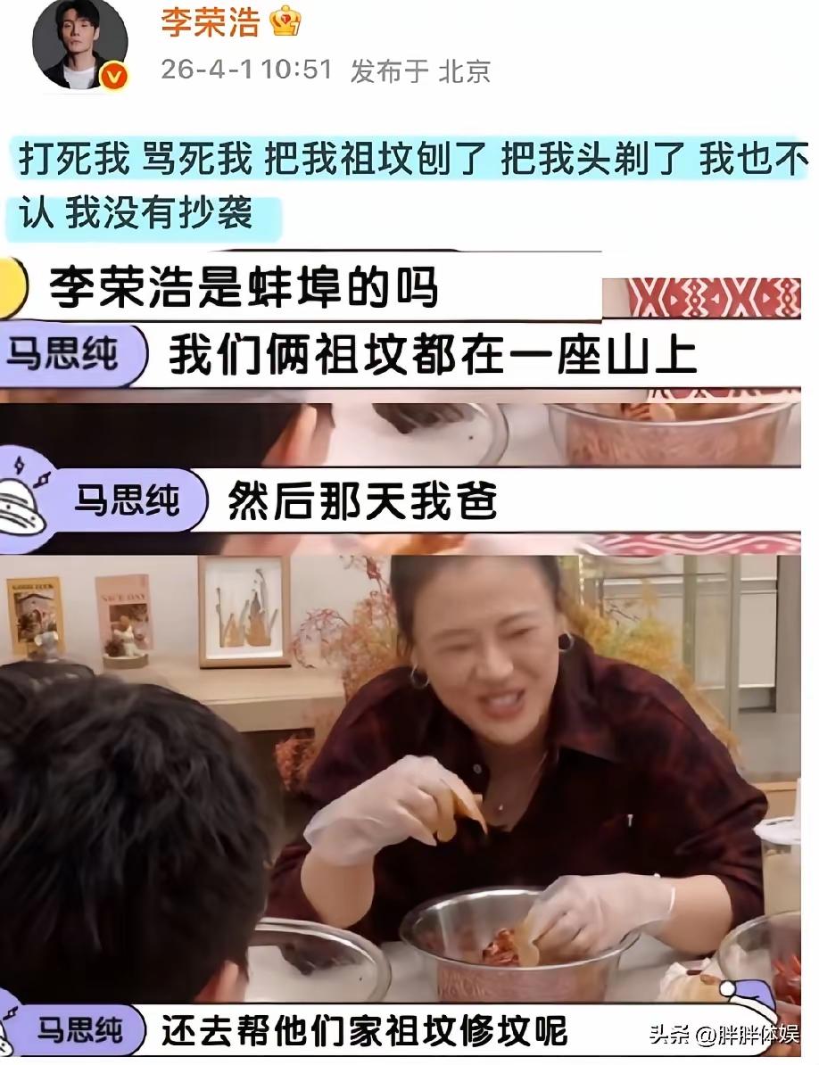 李荣浩这波版权风波,谁能想到最大的“局外人受害者”是马思纯爸爸?这剧情比电视剧还离谱! 刷到消息时我人都懵了——两家不仅是同个民族,祖坟居然修在一块,马思纯爸爸还亲手帮李荣浩家修过祖坟?这关系绕得能编出一部家族伦理剧了。 想想马爸爸当时铲土砌砖的样子,说不定还念叨着“这坟修得扎实,保准后辈顺顺当当”。结果转头就看着李荣浩对着自家修过的祖坟发誓“没抄袭”,换谁不得叼着烟在门口叹气:合着我辛辛苦苦砌的墙,成了你发誓的道具?早知道给你留道缝透透气了! 网友扒出这层关系时,评论区直接炸了。有人说“这波是祖宗都没想到的联动”,还有人调侃“马爸爸:早知道当初少抹点水泥,让你吹吹风清醒点”。 其实这事最逗的是那种生活化的反差感——一边是娱乐圈的版权大战,闹得沸沸扬扬;一边是长辈坐在老家门口,看着自己修过的坟成了热搜焦点,估计边抽烟边摇头:现在的年轻人,连发誓都选这么费劲的地方。 说真的,这剧情比李荣浩的歌还上头。你永远猜不到娱乐圈的隐藏关联能有多离谱,前有明星撞脸素人,后有祖坟挨一块的“亲戚”互扯,下次是不是该扒扒谁家祠堂共用一个香炉了? 最惨还是马思纯爸爸,本来安安静静当幕后,突然被拽进热搜中心,还得被网友追问“修坟手艺多少钱一天”。估计现在正跟马思纯打电话:“下次再跟那小子做邻居,我高低得在中间种排仙人掌!” (纯属调侃,版权纠纷还是得靠法律解决哈)