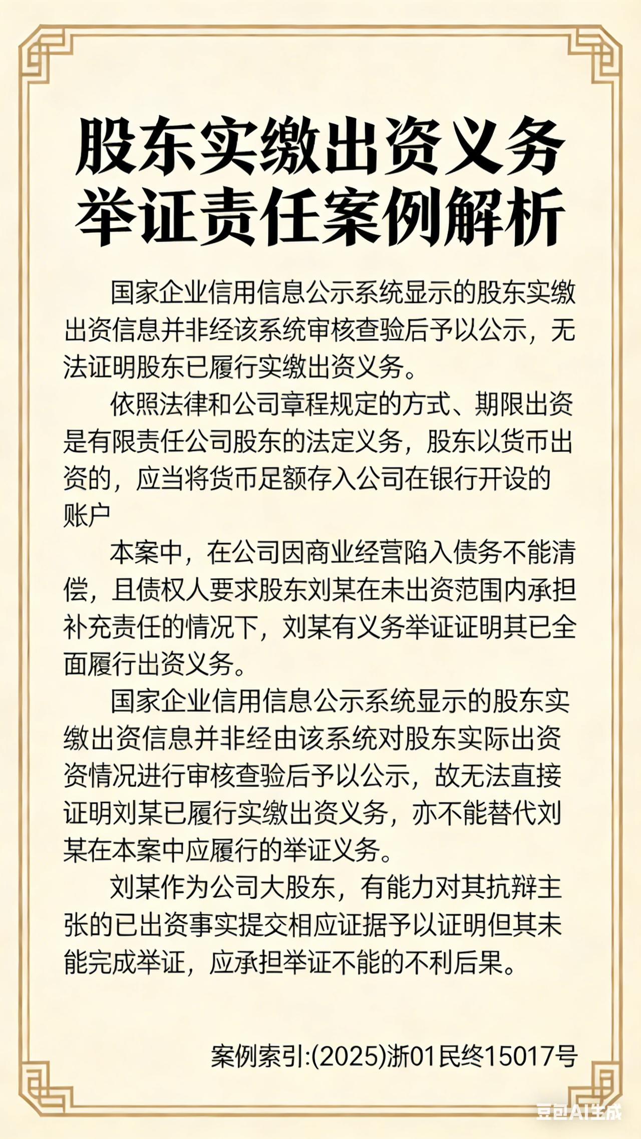 国家企业信用信息公示系统显示的股东实缴出资信息并非经该系统审核查验后予以公示,无法证明股东已履行实缴出资义务 依照法律和公司章程规定的方式、期限出资是有限责任公司股东的法定义务,股东以货币出资的,应当将货币足额存入公司在银行开设的账户。本案中,在公司因商业经营陷入债务不能清偿,且债权人要求股东刘某在未出资范围内承担补充责任的情况下,刘某有义务举证证明其已全面履行出资义务。国家企业信用信息公示系统显示的股东实缴出资信息并非经由该系统对股东实际出资情况进行审核查验后予以公示,故无法直接证明刘某已履行实缴出资义务,亦不能替代刘某在本案中应履行的举证义务。刘某作为公司大股东,有能力对其抗辩主张的已出资事实提交相应证据予以证明但其未能完成举证,应承担举证不能的不利后果。 案例索引:(2025)浙01民终15017号