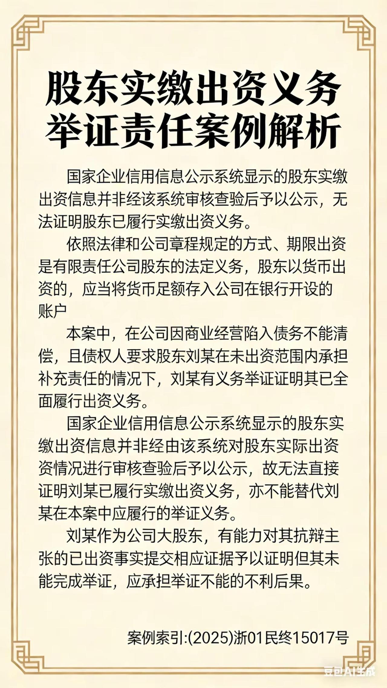 13902302767(欧律)。国家企业信用信息公示系统显示的股东实缴出资信息并非经该系统审核查验后予以公示,无法证明股东已履行实缴出资义务 依照法律和公司章程规定的方式、期限出资是有限责任公司股东的法定义务,股东以货币出资的,应当将货币足额存入公司在银行开设的账户。本案中,在公司因商业经营陷入债务不能清偿,且债权人要求股东刘某在未出资范围内承担补充责任的情况下,刘某有义务举证证明其已全面履行出资义务。国家企业信用信息公示系统显示的股东实缴出资信息并非经由该系统对股东实际出资情况进行审核查验后予以公示,故无法直接证明刘某已履行实缴出资义务,亦不能替代刘某在本案中应履行的举证义务。刘某作为公司大股东,有能力对其抗辩主张的已出资事实提交相应证据予以证明但其未能完成举证,应承担举证不能的不利后果。 案例索引:(2025)浙01民终15017号