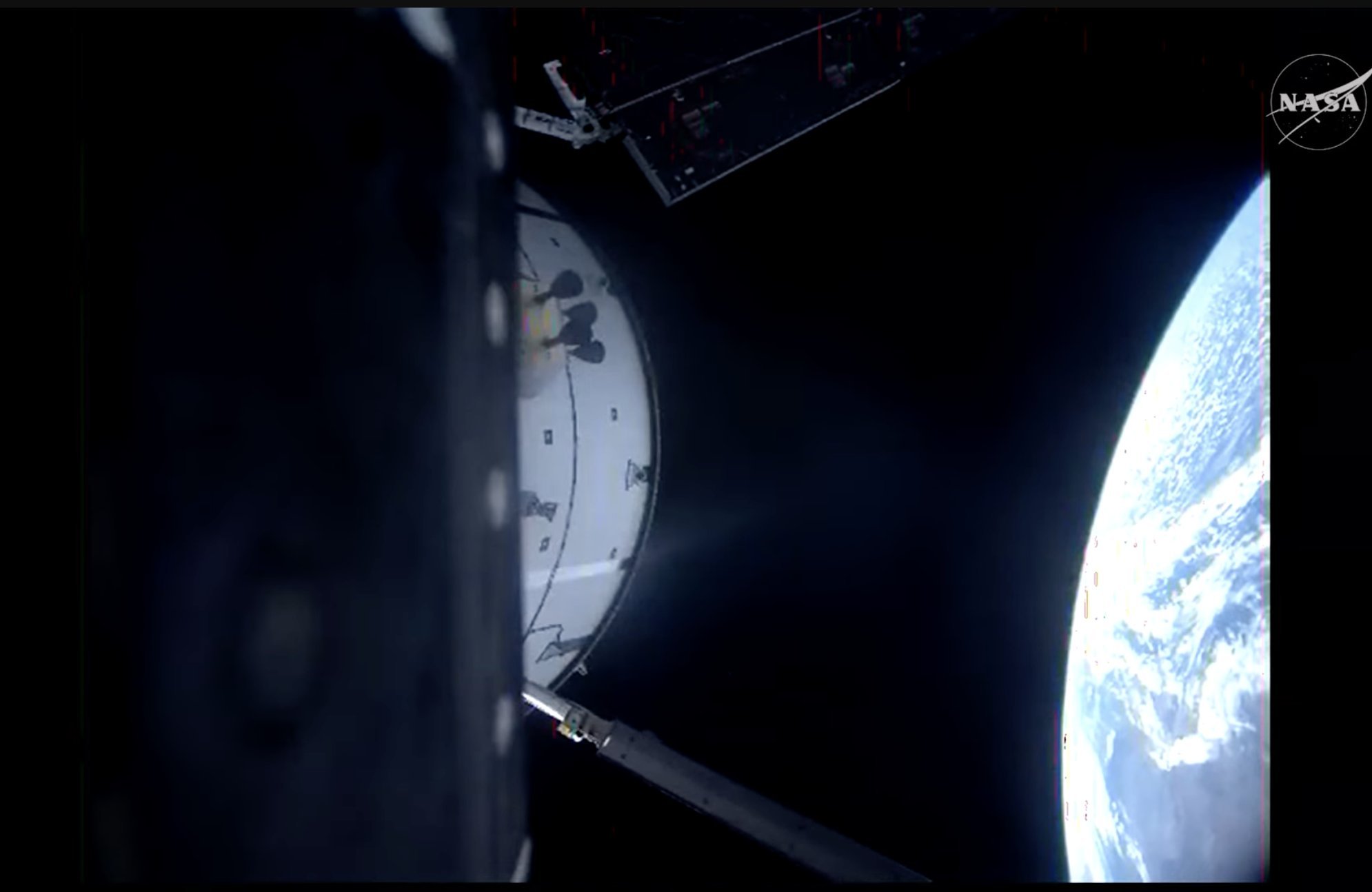 阿尔忒弥斯2号 猎户座飞船监控相机画面,目前地面中心和宇航员正在排除舱内厕所问题。