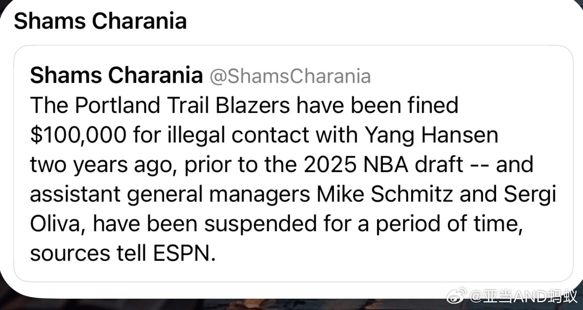 两年前,在2025年NBA选秀之前,波特兰开拓者队因与杨瀚森非法接触而被罚款10万美元——助理总经理迈克·施米茨和塞尔吉·奥利瓦被停赛一段时间。