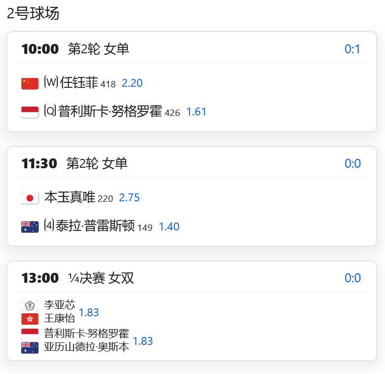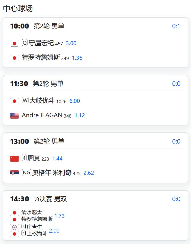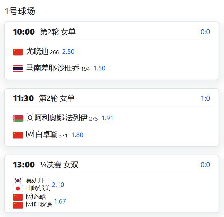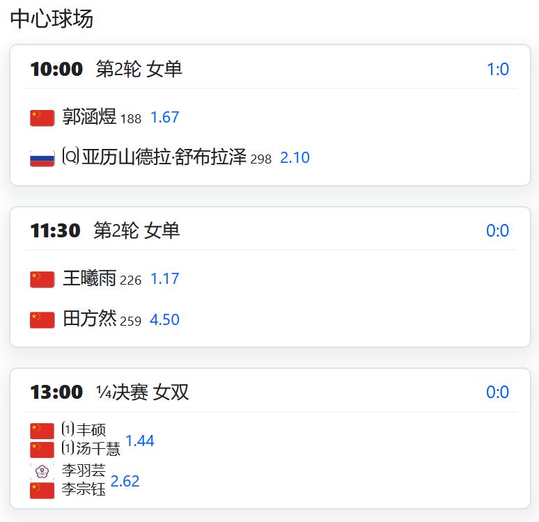 赛果: WTA500赛查尔斯顿站,女单第二轮,袁悦虽然在0-6,0-4的情况下连下五局,但仍难挽败局,以0-6,5-7负于科恰雷托,无缘晋级; WTA250赛波哥大站,女双四分之一决赛,杨钊煊/梁恩硕4-6,3-6不敌斯特拉科霍娃/吉洪诺娃,无缘四强。 赛程: W100六安,女单第二轮,郭涵煜将对阵资格赛球员舒布拉泽; 王曦雨对阵田方然; 淘汰了头号种子的尤晓迪将对阵另一位泰国球员沙旺乔; 白卓璇对阵资格赛球员法列伊; 任钰菲对阵努格罗霍; 女双四分之一决赛,丰硕/汤千慧对阵李宗钰/李羽芸; 施晗/叶秋语对阵具妍玗/山崎郁美; 港台组合李亚芯/王康怡对阵努格罗霍/奥斯本。 CH50宫崎,男单第二轮,周意将对阵塞尔维亚球员米利奇。