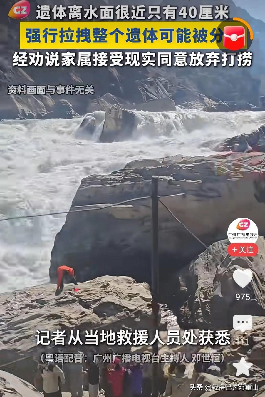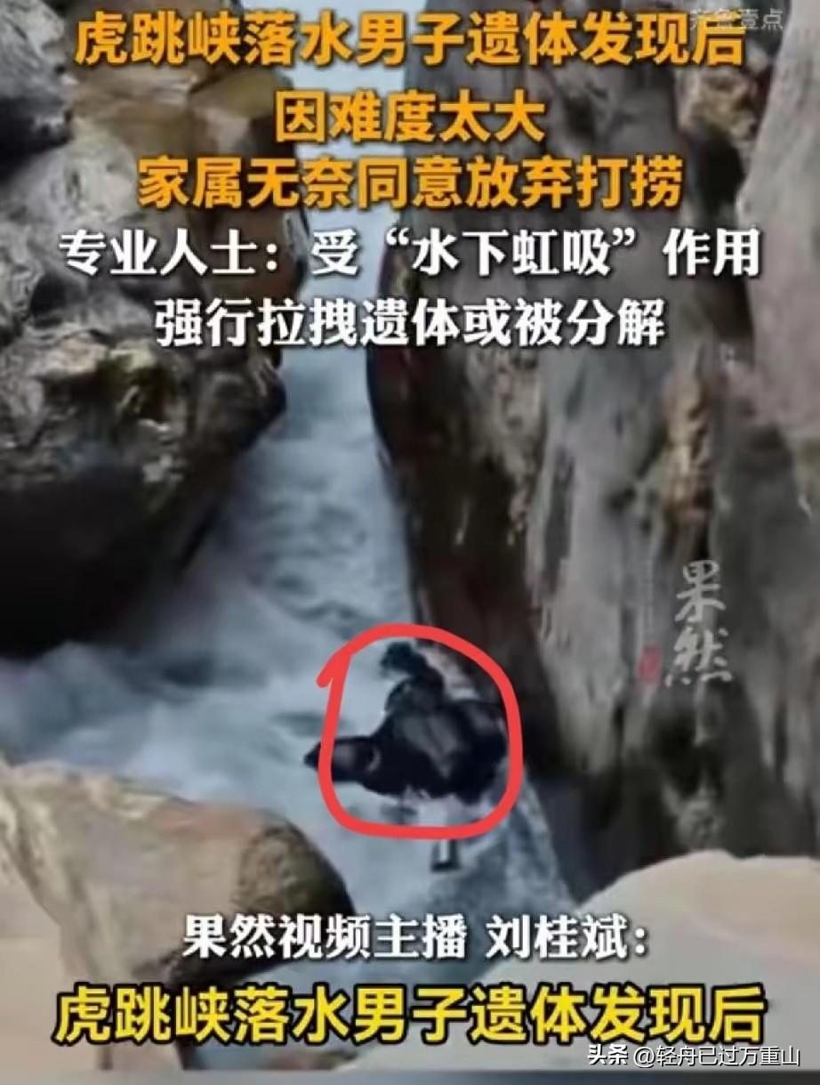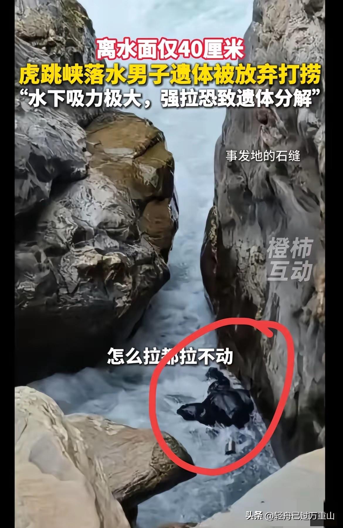 虎跳峡被卡住的那个男子,只能永远留在那里了,因为水下吸力大,强拉恐怕会导致遗体分解,他是家里的独子,才29岁,是一个美术老师,和女朋友要结婚了,请帖都印好了,但是一次旅游人没了。 不是不救,家人唯一的念想就是把遗体带回去安葬,但是救援队多次救援想打捞遗体,但终究还是无济于事,家人无奈之下只能含泪放弃,他从山东去云南旅游,因为意外连遗体都没办法打捞上岸,实在痛心不已 。 当时救援队赶到,用了各种办法都没能把人拉上来。后来,通过水下探头,发现遗体距离水面也就5米,可怎么都弄不出来。因为人类的力量在大自然面前实在微不足道,男子被虹吸在水下,强行打捞一是救援人员的安全受到威胁,二是就算强行打捞遗体也会被分解,毕竟遗体已经在水下面泡了一个月了。 现场的救援人员很清楚自己的极限。有队员说,自己系好了安全绳,下来后也只能摸到人,却因为水流像“抽风机”一样把人死死吸在石缝里,哪怕几个人合力都没用。水下强劲的虹吸让遗体完全无法撼动,连摄像头都差点被拽进去。 他掉下去那天是2月25号下午三点四十,就为洗个保温杯失足落水了,杯子还在岸边,盖子拧着,里面半杯凉白开。他二十九岁,美术老师,婚礼请柬印好了,就差填日期。 未婚妻当时劝他不要下去洗,用湿纸巾擦擦得了,但是他没有听劝,一个劲爬到发疯石上面,湿滑石头一下子让他滑倒,女友看到他掉下去用登山棍去拉他,没想到湍急的河流之间把登山棍崩断,导游下去都救援差点没上来。 虎跳峡的水真的太湍急了,发疯石不是一般的恐怖,上面都是湿滑的青苔,人一站上去根本无法站稳,虽然旁边有警示牌有护栏,但是男子还是不够慎重,对大自然的危险产生了误判,总是抱着侥幸心理,但是永远也上不了了,不懂得敬畏大自然真的很危险。