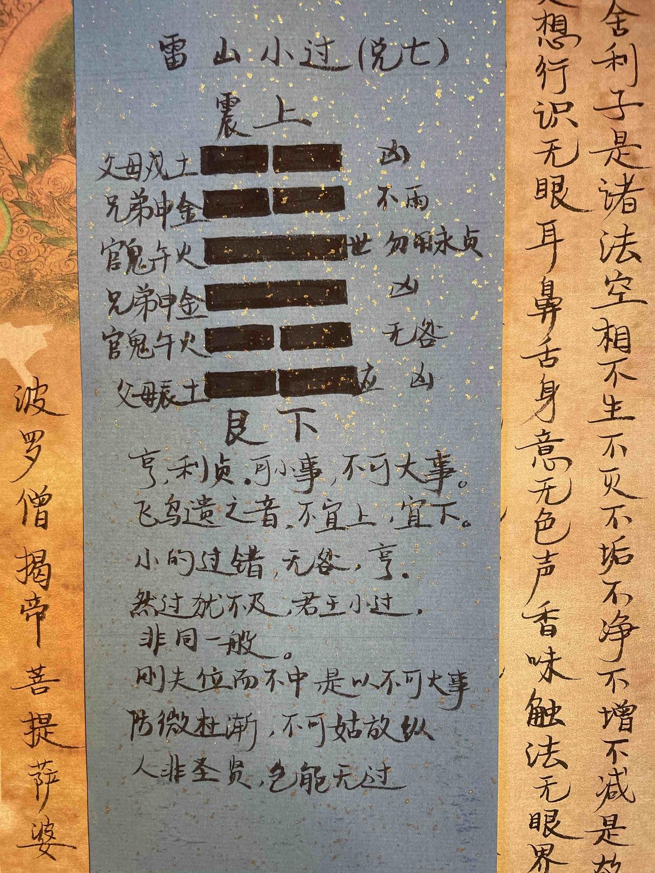 62雷山小过 亨,利贞。可小事,不可大事。飞鸟遗之音,不宜上,宜下。 初六,飞鸟以凶。 六二,过其祖,遇其妣。不及其君,遇其臣,无咎。九三,弗过防之,从或戕之,凶。 九四,无咎,弗过遇之,往厉必戒。勿用永贞。 六五,密云不雨,自我西郊,公戈取彼在穴。 上六,弗遇过之,飞鸟离之,凶,是谓灾眚。 雷山小过卦,艮下震上,雷在山上。 君子有小的过错,关系不大,还是通顺的。但是做小事顺利,吉,大事不利。 但是君王过犹不及,看上去是小的过错,但是不非同一般,上行下效,不利而凶。 要防微杜渐,有过错就要告诫。没有过错要防备他犯过错。如果放纵他,反而会害了他,最后招来灾祸。 易学智慧 雷山小过 国学文化 传统文化 写字是一种生活