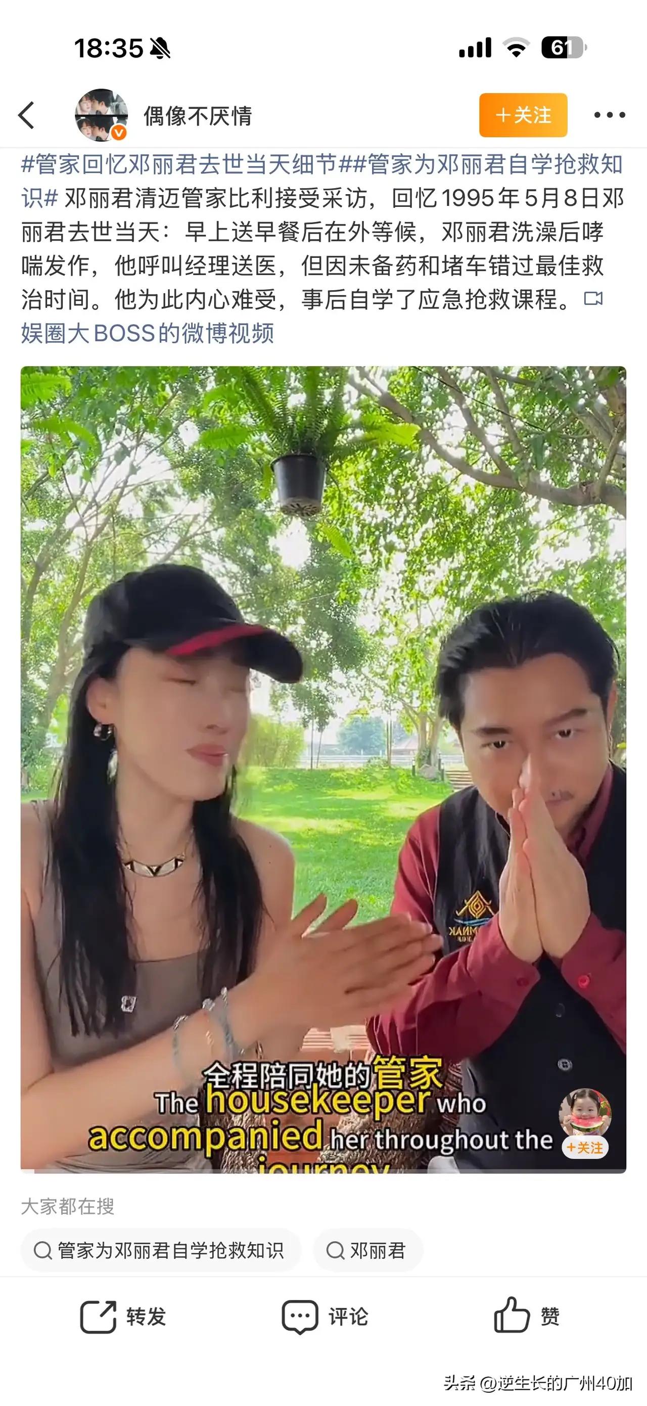 邓丽君去世真相被清迈酒店管家曝光 31年前邓丽君在泰国清迈因哮喘病去世, 近日,其发病和去世过程被当时所住酒店的管家曝光。 原来1995年5月8号当天,邓丽君早上起床时一切正常,当时管家还去给她送了早餐,到了下午,邓丽君和往常一样开始健身,结束之后去冲凉洗澡,不过在洗澡过程中,邓丽君哮喘发作,但遗憾的是法国小男友此时在外面买水果,房间里无人帮忙急救。 不过邓丽君的求生欲望很强,她使出全身力气连走带爬离开房间来到走廊求救,后面被酒店管家发现,此时的邓丽君已经手脚已经出现痉挛和麻木,管家帮忙叫了救护车,但由于事发时段接近清迈晚高峰,路上十分拥堵,邓丽君在送往医院的路上又耽搁了一段时间,等到医院的时候已经香消玉殒。 事后这位第一个发现邓丽君出事的管家被要求封口,直到30年后他才站出来讲明当时的真实情况。邓丽君 邓丽君经典影像 邓丽君经典日语 邓丽君歌曲连唱 邓丽君传记
