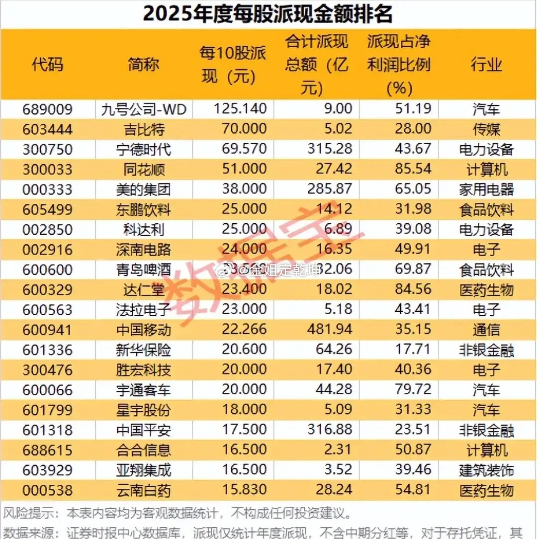 2025年A股市场高派现个股阵营持续扩容,分红标的遍布汽车、传媒、电力设备、计算机、家电、食品饮料、电子、通信、非银金融、医药生物、建筑装饰等多个主流行业,形成了全行业覆盖的高分红格局。其中九号公司-WD以每10股派现125.14元的亮眼数据,实现分红力度断层式领先,榜单中既有宁德时代、中国移动这类市值千亿的行业龙头,也不乏同花顺、吉比特等细分赛道高盈利优质标的,整体呈现出“大额派现与高比例分红并存、龙头企业与细分黑马共舞”的特点。