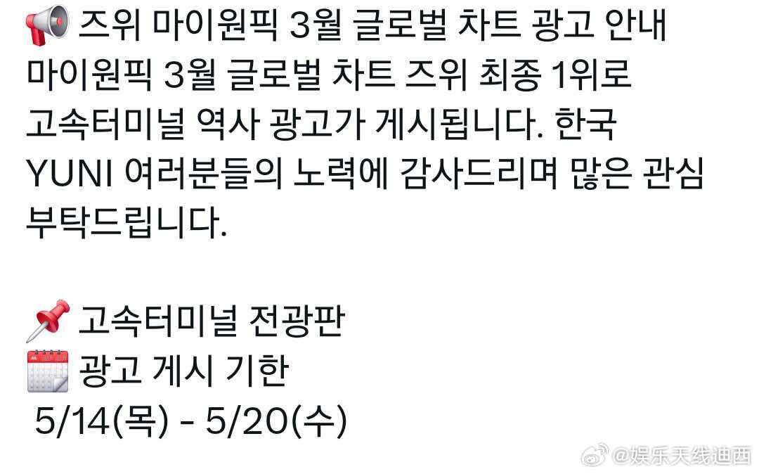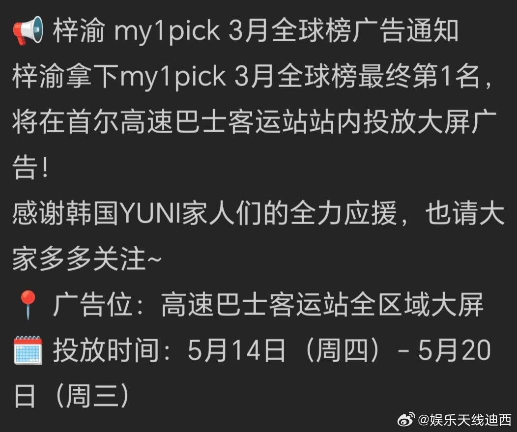 梓渝 刷到了梓渝的韩国粉丝也很强啊韩国yuni自发组织的投票,梓渝拿下了第一,可以在首尔人流量极大的客运站里投放大屏!梓渝情深深雨濛濛上线