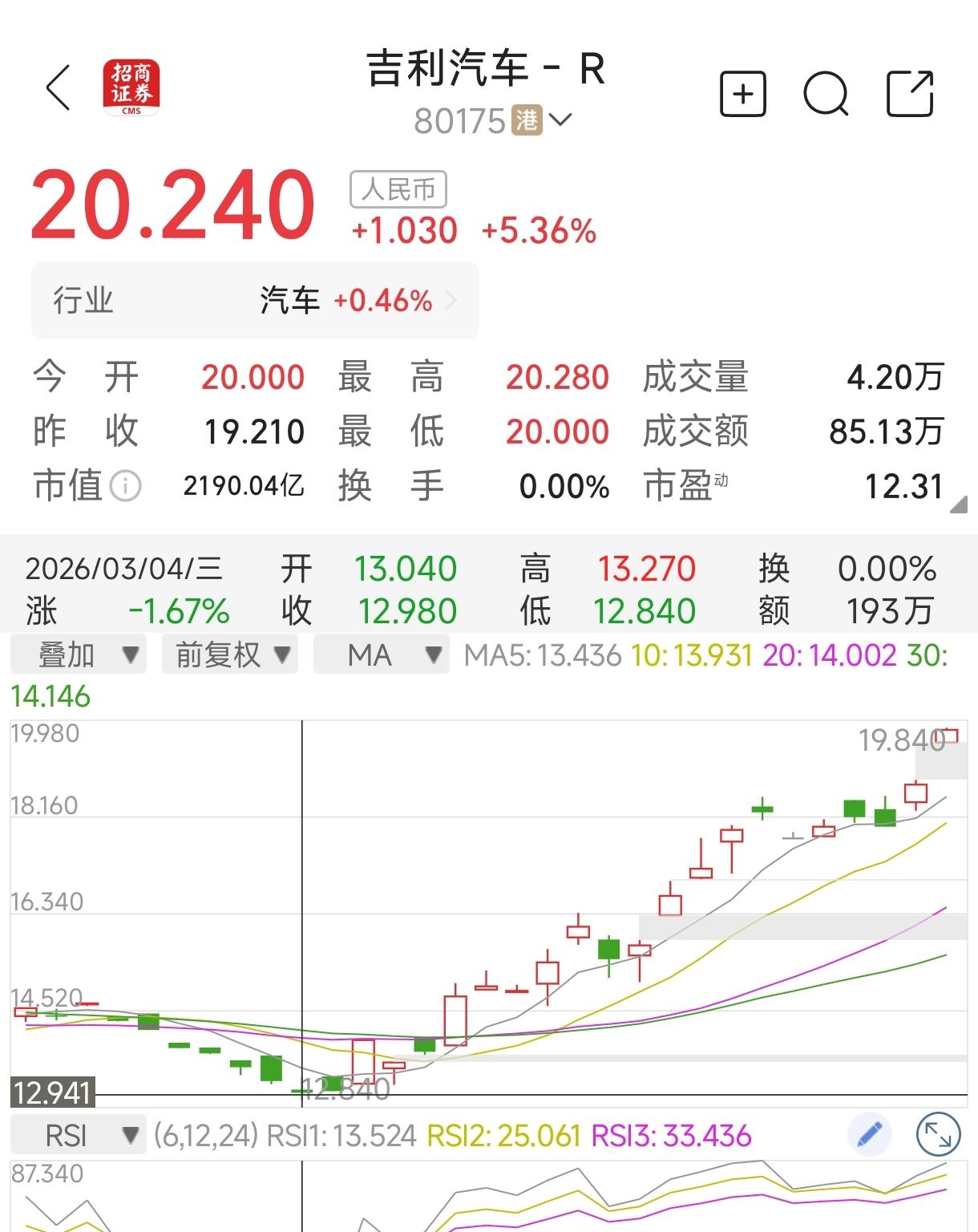 吉利汽车股价开盘大涨5.36%,上涨1.03港元,当前股价20.24港元,市值2190亿港元,约相当于1930亿元人民币。从3月4日低点12.98元开始反弹,吉利汽车股价这一个月上涨 56%,是同期表现最好的汽车股。 吉利汽车股价大涨与其3月份及一季度销量数据有关,销量规模、出海增速,奠定了吉利汽车作为自主品牌车企佼佼者的行业地位。一季度,吉利汽车累计销量70.9万辆,其中3月份销量23.3万辆,都处于行业前茅且实现稳定增长,其新能源汽车和燃油车并举的产品矩阵表现出强大的韧劲儿,海外市场销量更是惊艳:3月份海外销量81639辆,一季度累计203024辆,累计同比增长126%。