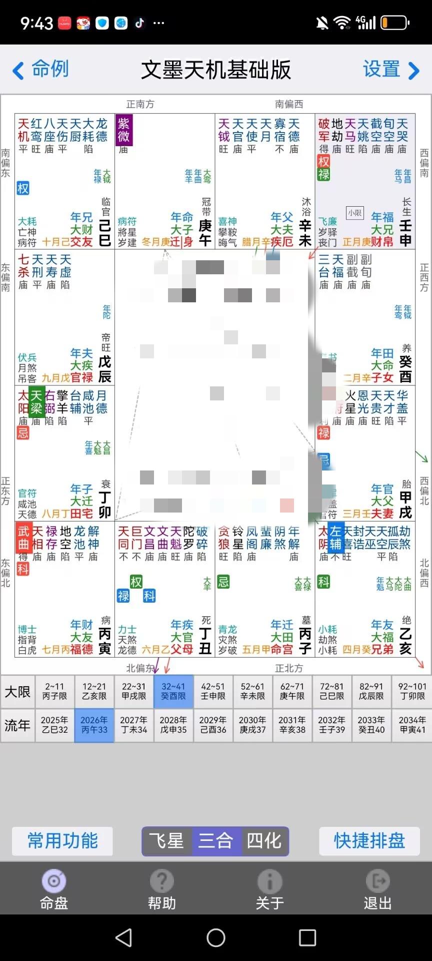紫微斗数一点通 紫微斗数的细致性,其实挺有意义的,让我们认识一点,如果能做到一点,相信在生活中就会增加一些助力,比如看生年四化。 化禄代表的含义有温和,财富,多的,有情,享受,快乐,爱,喜悦,分享,增加等。 化权代表的含义有权力,大的,执行,掌权,争夺,占有,强迫,规矩等。 化科代表的含义有名气,小的,斯文,感性,爱面子,华而不实的,虚荣,虚假,不积极的。 化忌代表的含义有已心,干扰,少的,执着,不顺,抓紧,收敛,堵塞,攻击,过犹不及,不足够,烦恼等 而化禄,是一个人厉害的地方,喜欢的,擅长的的地方;化忌,是一个人不厉害的地方,或者不喜欢的,弱势的。就是在自己个性上不在行,不喜欢的事。 比如说这个盘,廉贞化禄,在人际交际上是擅长的,得人缘,在交际上会有很好的发挥,在那工作中也是一个很好的辅助;太阳化忌,太阳是发光发热的,说明不喜欢高调或者是表现自己。 另外来看一个这个盘的财运今年是上升了还是下降了,依然是数禄,再来练一下。 25年本财一个大禄,一个禄存,一个大禄,为3;大财一个年禄,为1;年财一年年禄为1,所以25年的禄的总和数字为5. 26年本财一个大禄,一个禄存,一个大禄,为3,大财一个年禄存,一个年化禄,为2;年财一个禄存,一年大禄,为2,所以26年的禄的数字总和为7. 比较下来,这个盘今年的财运是有所提升,还是不错的。 关于紫微斗数的碎碎念,每天坚持一点,总会有那么些收获,继续加油。