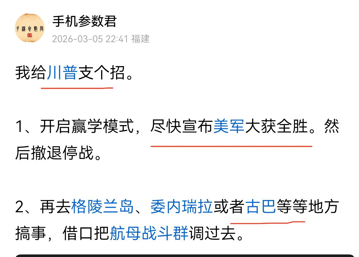 川普肯定是看了我的动态。下次记得点赞。[狗头] 回归正题,“赢麻了”的川普会撤兵吗?我的答案是不会。他是为了炒股。 只要伊朗不愿意停战,川普就无法撤兵。美国已经事实上成为以色列的战争代理人,川普绝对不敢抛弃以色列不管。至于会不会打地面战,这个不好判断。正常人都不会打,但川普并非正常人。[捂脸]