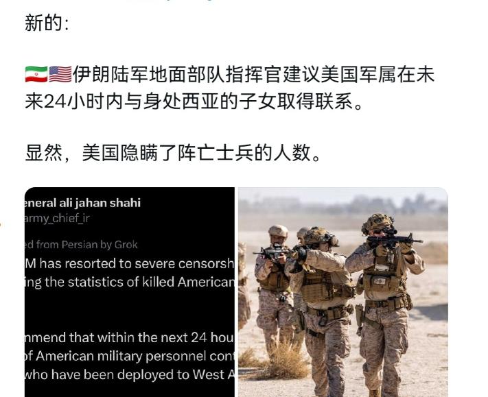 侮辱性极强!伊朗喊话美军家属!4月1日,根据外媒报道,伊朗陆军地面部队指挥官喊话美军家属称,建议他们在未来24小时内与他们在西亚的孩子联系。显然,这番看似平静的提醒,背后指向的,就是伊朗已经确认美军遭到的伤亡,比想象中的更多。 这位伊朗指挥官,他叫穆罕默德·卡拉米,是伊朗伊斯兰革命卫队地面部队司令,早在2025年6月就被伊朗最高领袖哈梅内伊任命到这个岗位,之前还担任过革命卫队圣城作战基地的指挥官,经验丰富,而且一直是美军重点关注的对象,美国、加拿大和欧盟都曾对他实施过制裁。 能让这样一位高级指挥官亲自出面喊话,足以说明这件事的分量,也能看出伊朗的态度——不是随口说说,而是有十足的把握和底气。 其实这段时间,美军和伊朗在西亚的摩擦就没断过,美军一直把西亚当作自己的势力范围,时不时在伊朗周边部署兵力、搞军事演习,还联合盟友对伊朗实施各种打压,可伊朗从来没服过软,一直都在强硬反击。 就在这次喊话前几天,伊朗方面就已经公开披露,他们的武装部队精准定位了美军的两个藏匿点,一个在阿联酋迪拜,聚集了超过400名美军,另一个藏匿点也有100多名美军聚集。 随后,伊朗伊斯兰革命卫队用精确制导导弹和无人机,对这两个据点发动了打击,并且明确表示,这次打击造成了“极其严重”的伤亡,救护车连续好几个小时都在忙着转运死伤者,里面不仅有普通的美军士兵,还有美国指挥官。 而美军这边,虽然一直在刻意隐瞒伤亡情况,但还是没能藏住。当地时间3月27日,有美国国防部官员偷偷透露,自从针对伊朗的作战行动开始以来,已经有超过300名美军士兵受伤,其中75%以上的伤员都出现了创伤性脑损伤,还有13名美军士兵在行动中阵亡。 到了3月31日,又有美国官员补充披露,受伤人数已经涨到了348人,虽然其中315人已经重返岗位,但还有6人伤势严重,随时可能有生命危险。 除此之外,伊朗之前袭击驻有美军的沙特苏丹王子空军基地时,还造成了20多名美军受伤,多架美军的预警机和空中加油机也遭到了不同程度的损坏,这些都是实打实的伤亡和损失,容不得美军狡辩。 大家都清楚,美军一直以来都喜欢在国际上装强硬,每次发动军事行动,都只敢报喜不报忧,要么刻意隐瞒伤亡人数,要么把伤亡情况说得轻描淡写,就是想稳住国内民众的情绪,也想在盟友面前撑场面,彰显自己的军事霸权。 可这次伊朗直接喊话美军家属,等于是把美军的遮羞布直接扯了下来,明着告诉全世界,你们的士兵在西亚伤亡惨重,我们已经掌握了所有确切消息,你们再想隐瞒也没用。 估计美军指挥官当时也特别尴尬,本想在西亚耀武扬威,打压一下伊朗的气势,结果偷鸡不成蚀把米,不仅被伊朗精准打击,造成了大量人员伤亡,还被伊朗直接打脸,连自己士兵的伤亡情况都被对方摆到了台面上,想反驳都没底气——毕竟伊朗说的都是事实,美军自己披露的伤亡数据,也间接印证了这一点。 他们本以为能靠着军事优势压制伊朗,却没想到,伊朗不仅敢反击,还能精准掌握他们的部署和伤亡情况,甚至敢直接喊话美军家属,这份底气,可不是装出来的。 伊朗这次的喊话,看似平静,实则态度强硬,每一句话都带着警告。它不是故意要侮辱美军家属,而是想通过这种方式,告诉美军和全世界:美军在西亚的挑衅行为,已经付出了惨痛的代价,而且这个代价还会继续扩大;同时也提醒美军家属,你们的孩子在西亚不是在“执行正义任务”,而是在参与一场不义的挑衅,随时都可能面临生命危险。 这比直接骂美军更有杀伤力,因为它直击要害,让美军的霸权嘴脸暴露无遗,也让全世界都看清了美军在西亚的真实处境。 这件事虽然只是一次喊话,但背后反映的是西亚地区军事博弈的激烈程度。美军一直想在西亚称霸,不断挑衅伊朗,试图打压伊朗的势力,可伊朗从来没有退缩过,用一次又一次的反击,证明了自己的决心和能力。 这次喊话美军家属,就是伊朗的一次强硬表态:我们不仅能精准打击美军的据点,造成他们大量伤亡,还能让全世界都知道真相,别再试图欺压我们,否则只会付出更惨痛的代价。 要知道,伊朗不是没有实力,它的导弹和无人机技术都很先进,这次能精准打击美军藏匿点,就足以说明问题。而且伊朗的态度一直很明确,只要美军不停止在西亚的挑衅,他们就会一直反击下去,不会有丝毫妥协。这次的喊话,就是伊朗给美军的一个警告,也是他们捍卫自身利益的决心体现。 反观美军,看似强大,实则外强中干,在伊朗的强硬反击下,不仅损失惨重,还丢尽了脸面。他们本想通过挑衅彰显自己的霸权,结果却被伊朗狠狠打脸,伤亡人数远超预期,连家属都被伊朗直接喊话提醒。 美国的霸权主义终究是行不通的,任何国家的挑衅行为,最终都会付出应有的代价。