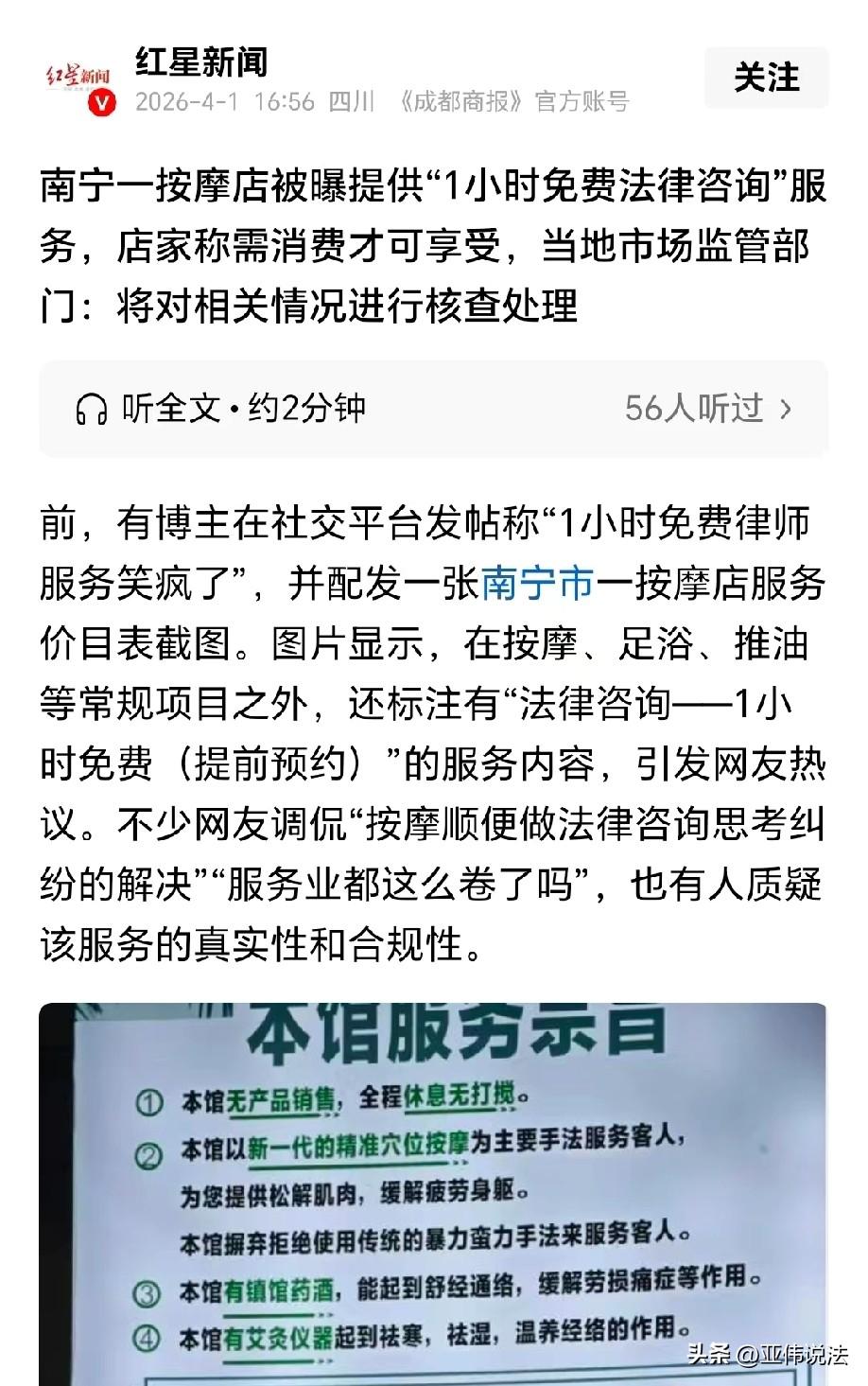 “服务行业卷成这样了吗?”广西南宁,男子发、现按摩店的菜单里,除了正常的按摩足浴套餐外,竟然还提供1小时免费法律咨询服务,只要在店里消费,就可以走消费过程中免费享受一小时免费律师服务。目前,当地市场监管部门已介入处理,将对相关情况进行核查。网友:按摩都要法律职业资格证了吗?还是律师兼职按摩了? 南宁一位男子偶然发现,某按摩店的价目表里,竟然冒出了免费法律服务的内容,两个八竿子打不着的行业,怎么会组合服务呢? 事发当天,这名男子去青秀区一家按摩店按摩,看到店里的服务菜单格外不一样。 除了精准穴位按摩、足浴、推油这些常规的按摩项目外,在收费项目后面,居然还专门列了一项法律咨询,1小时免费。 男子当时就觉得特别新奇,按摩店本该做养生服务,怎么还跨界搞起了法律咨询,这组合实在太违和,他心里满是疑惑,便把这份价目表拍了下来发到网上。 帖子一发出,网友们立马炸了锅,纷纷留言调侃。 有人打趣说,现在按摩师都要考法律职业资格证了?还是律师兼职干按摩了? 还有人开玩笑:以后按摩的时候,一边放松身体,一边顺便咨询法律纠纷,这也太高效了。 还有人感慨:现在服务业竞争太激烈,为了吸引顾客,居然想出这种跨界引流的法子。 同时也有不少人提出质疑,觉得这项服务可能就是个噱头,也担心提供咨询的人不专业,根本没有相关资质。 4月1日,记者看到这则网帖后,也觉得十分蹊跷,为了弄清楚真假,便以顾客的身份联系了这家按摩店。 店里工作人员接到电话后,很爽快地承认确实有这项服务,还详细解释了规则。 这个法律咨询是附加服务,必须先在店里消费按摩、足浴等项目,才能免费享受,不消费是不能单独咨询的。 法律咨询可以在按摩的过程中进行,一小时内免费,要是超过一小时,就不再免费了。 记者还了解到,提供法律咨询的人员并不是专业的执业律师,只是给顾客帮忙解答一些法律咨询业务。 这让不少人担忧,非专业人员提供法律咨询,不仅不专业,还可能存在不合规的问题,这显然不是简单的附加服务那么简单。 随后,记者把了解到的情况,反馈给了当地的市场监督管理局。 工作人员表示会针对这家按摩店的经营范围、服务资质以及该项服务的合规性,展开全面的核查处理。 目前,核查工作还在进行中。 不少人也期待监管部门的调查结果,看看这家按摩店的奇葩跨界服务,到底是合规的引流手段,还是存在违规问题。 如今各行各业内卷严重,但做生意还是要守规矩,不能超出经营范围,更不能拿不专业的服务糊弄消费者。 《律师法》第十三条明确规定:没有取得律师执业证书的人员,不得以律师名义从事法律服务业务;除法律另有规定外,不得从事诉讼代理或者辩护业务。 按摩店经营范围为养生按摩,无法律服务资质,且咨询人员非执业律师。 至于其宣称“免费法律咨询”并绑定消费,存在超范围经营与无资质提供法律服务双重问题。 如果以“律师服务”宣传,更违反以上规定。 另外,《律师法》第五十五条还规定,无资质人员以律师名义执业,可被责令停止非法执业、没收违法所得、罚款。 不仅如此,市场监管部门可依据《市场主体登记管理条例》查处超范围经营,责令改正、罚款。 按摩店这样的做法,既误导了消费者,也扰乱法律服务市场秩序,涉嫌违法违规,后果恐怕有些严重。