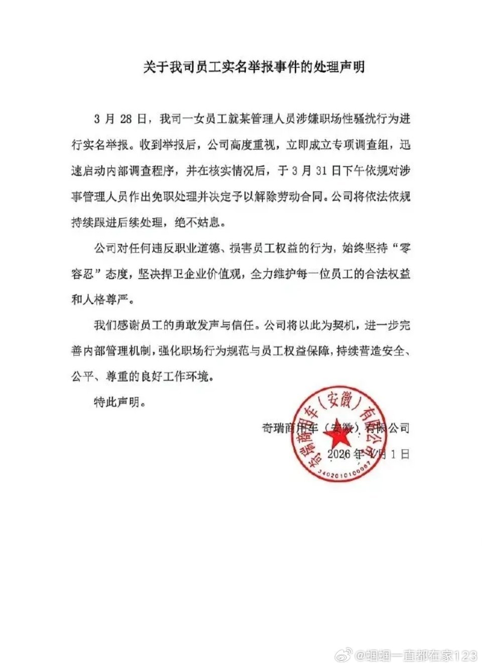 奇瑞奇瑞商用车员工举报高管性骚扰