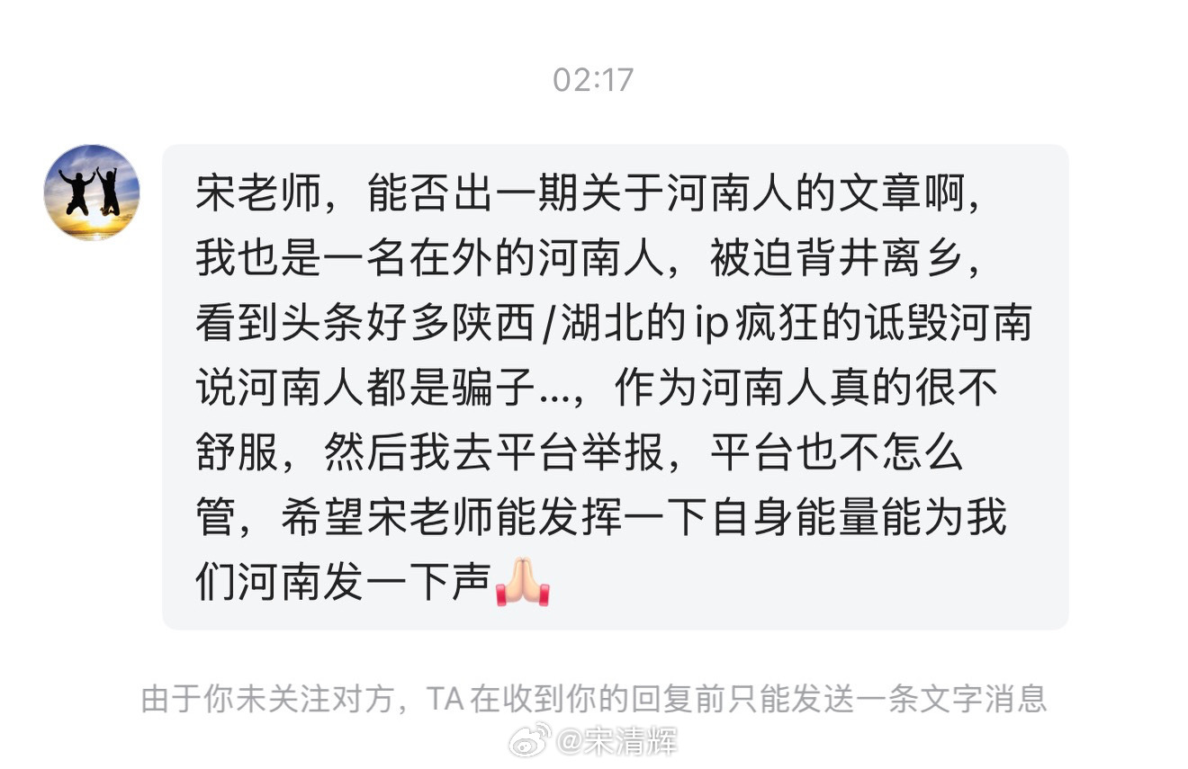 四川网友留言 宋老师,能否出一期关于河南人的文章啊,我也是一名在外的河南人,被迫背井离乡,看到头条好多陕西/湖北的ip疯狂的诋毁河南说河南人都是骗子…,作为河南人真的很不舒服,然后我去平台举报,平台也不怎么管,希望宋老师能发挥一下自身能量能为我们河南发一下声宋清辉看河南