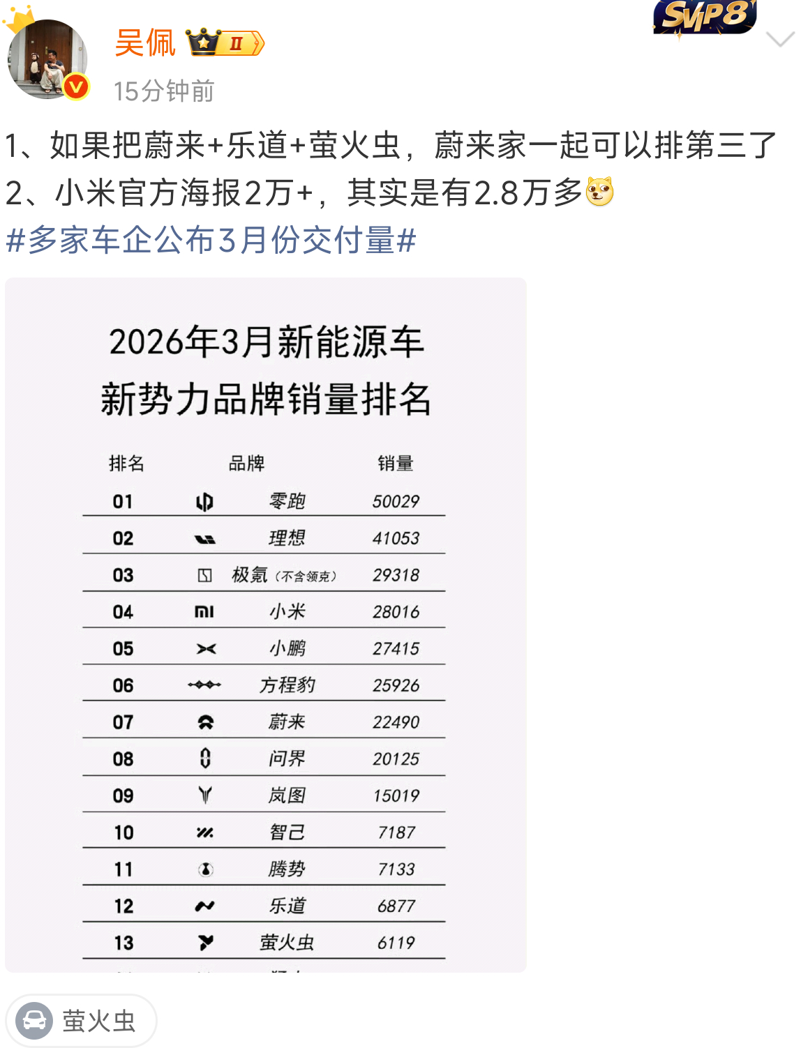 盯着小米没用,被偷家也是分分钟的事,车企风水轮流转,你看吉利不盯着小米,它好起来了,蔚来也好起来了,理想依然是大哥,真应了那句话,忽悠雷军进场,堪称本世纪车圈最伟大操盘。