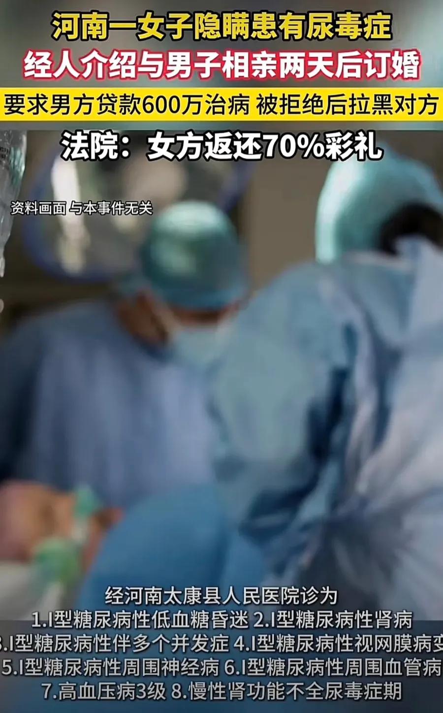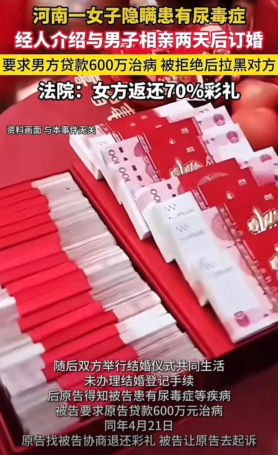 太缺德!相亲2天订婚后女方称患尿毒症,要求男方贷款600万元为她治病。男方提出退还彩礼,好聚好散,遭女方拒绝后起诉,法院判决来了。 事情发生在河南,男子周某某经媒人介绍,认识了女子张某某。本来就是奔着结婚去的相亲,谁知道节奏快得离谱,两人见面才两天,就直接敲定了订婚。按照当地的习俗,周某某给了女方188000元彩礼,还有三金、50000元车款,加起来一共238000元,一分不少地交到了女方手里。 之后两人办了婚礼,以夫妻名义共同生活,但没领结婚证。本来周某某还以为自己捡了个便宜,闪婚娶到了媳妇,结果没安稳几天,就得知了一个晴天霹雳的消息:女方早就患有尿毒症,还有一长串严重的并发症,从糖尿病肾病到高血压3级,全是需要长期花钱治疗的重病,而这些,女方从相亲到订婚,全程都瞒着他。 更离谱的还在后面。女方直接开口,要求周某某去贷款600万,给她治病。周某某彻底懵了,自己本来就是普通人家,攒彩礼钱已经不容易,别说600万,就是60万都拿不出来,更何况是贷款给一个刚认识没几天、还隐瞒重病的人治病。他当场拒绝了这个无理要求,结果女方直接把他拉黑了。 周某某没办法,只能找女方协商退彩礼,想好聚好散,把自己的钱拿回来。谁知道女方态度极其嚣张,直接让他去法院起诉,摆明了就是不想退钱。无奈之下,周某某只能把女方告上了法庭。 法院审理后查明,女方确实隐瞒了自己患有尿毒症等重大疾病的事实,而且双方并未办理结婚登记手续,符合彩礼返还的法定条件。最终判决女方返还70%的彩礼,也就是166600元。 这事真的越想越气,这哪里是相亲结婚,分明就是设了个局,想找个冤大头给自己治病买单。相亲两天就订婚,快得不正常,摆明了就是有预谋的。男方本来是抱着真诚找对象的心态,结果不仅钱没了,还差点背上600万的巨额贷款,换谁都得崩溃。 现在很多人相亲结婚,最怕的就是遇到这种隐瞒重大疾病、骗婚骗彩礼的事。婚姻的基础是真诚和信任,连自己的健康状况都要刻意隐瞒,还狮子大开口要对方贷款几百万,这根本不是结婚,就是赤裸裸的诈骗。 好在法院给了男方一个公道,判了返还彩礼。但还是要提醒大家,相亲结婚一定要擦亮眼睛,多了解对方的真实情况,尤其是健康状况,千万不要被闪婚的节奏冲昏头脑,不然最后人财两空,哭都没地方哭。 各位读者你们怎么看?欢迎在评论区讨论。