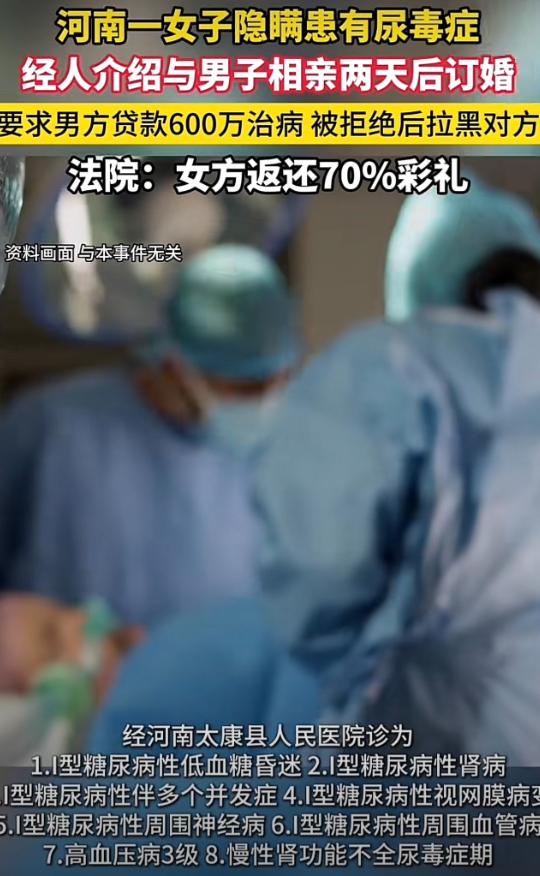 “太缺德!”河南,一男子花238000元彩礼,与相亲仅2天的女子订婚,岂料刚结完婚,女子竟告诉男子自己患有尿毒症,还要男子去贷款600万给她治病,男子不肯,要女子退钱,却被对方拒绝并拉黑,还称:“你可以去告我!” 事情的起因,是男方周诚的终身大事。 年纪不小的他,一直没能找到合适的对象,家里人急得团团转,四处托媒人帮忙说亲,就盼着他能早日成家。 就在2025年1月初,经媒人介绍,周诚认识了邻镇的女子张小莉,两人见面后简单聊了几句,彼此印象还算不错,没什么太大的分歧。 谁也没想到,张小莉比周诚还要急切,见面没过多久就主动提出,既然双方都满意,不如尽快订婚,别浪费时间。 周诚心里其实有些犹豫,毕竟两人刚认识,连基本的了解都不够,这么仓促订婚太不稳妥。 可架不住自己年纪大、家人催得紧,又难得遇到一个看着合眼缘的人,他最终还是压下了顾虑,答应了张小莉的提议。 相亲仅仅两天,也就是1月7日,两人就按照当地的农村习俗,举行了简单的订婚仪式。 订婚当天,张小莉就向周诚和他的家人提出了彩礼和三金的要求,为了能顺利成家,周诚的家人没有丝毫犹豫,四处奔波借钱,东拼西凑才凑齐了18.8万元的现金彩礼,又花了5万元,给张小莉买了三金和一辆车,前前后后合计23.8万元,全部交到了张小莉手中。 这笔钱,是周诚家半辈子的积蓄,还有不少是向亲戚朋友借的,每一分都来得不容易。 订婚后,两人又忙前忙后筹备了一个多月的婚礼,举办了热闹的结婚酒宴,宴请了双方的亲友,所有人都以为,周诚终于成家,能开启新的生活。 可很少有人知道,这场看似圆满的婚约,从一开始就藏着猫腻——两人只办了酒宴,并没有去民政部门办理结婚登记手续,名义上是夫妻,实际上只是同居关系。 婚后没几天,周诚就发现了不对劲。 张小莉的精神状态总是很差,每天都会按时服用一些药物,而且服药的时候,总会刻意避开他,不让他看到。 除此之外,张小莉还经常偷偷往医院跑,问她怎么了,她也只是含糊其辞,说自己只是小感冒,没什么大事。 周诚心里的疑虑越来越重,他开始留意张小莉的一举一动,在他的反复追问下,张小莉终于瞒不住了,说出了一个让周诚瞬间崩溃的真相:她长期患有多种严重的慢性疾病,其中就有尿毒症和糖尿病,还有高血压等其他病症,加起来足足有8种,这些病需要长期服药控制,而且治疗费用高得吓人。 更让周诚无法接受的是,张小莉说出病情后,没有丝毫愧疚,反而理直气壮地向他提出了一个荒唐的要求——让他去贷款600万元,用来给她治病。 600万,对于一个普通农村家庭来说,无疑是一个天文数字,周诚连彩礼钱都是借的,根本不可能拿出这么多钱,更别说去贷款了。 可张小莉的态度却异常强硬,不仅一口拒绝了退还彩礼的要求,还放话说,有本事就去告她。 面对周诚的反复协商,张小莉和她的家人不仅避而不见,后来更是直接把周诚的微信、电话全部拉黑,彻底断绝了所有联系,摆出了一副耍赖到底的架势。 屋漏偏逢连夜雨,4月22日,张小莉因为糖尿病引发低血糖昏迷,被送进了医院。 通过医院的诊断证明,周诚才知道,张小莉的病情比他想象的还要严重,除了尿毒症、糖尿病、高血压,还有多种并发症,后续的治疗费用更是难以预估。 这让周诚更加坚定了要回彩礼的决心,他知道,继续耗下去,只会让自己损失更多。 协商无果,又被对方拉黑,周诚实在没有办法,只能拿起法律武器,将张小莉告上了法庭,希望通过法律途径,要回属于自己的财产。 法院受理案件后,围绕双方是否办理结婚登记、彩礼的性质、女方隐瞒病情的过错等核心问题展开了审理。 其实说到底,这场闹剧的根源,就是张小莉的不坦诚和贪婪。 身患重病确实值得同情,但这绝不是欺骗他人、索要天价钱财的理由。 周诚急于成家的心情可以理解,但仓促订婚、缺乏了解,也给自己埋下了隐患。 婚姻的基础是坦诚相待,而不是算计和欺骗,拿自己的病情当筹码,把别人当成提款机,最终只会落得人财两空的下场。 法院最终作出了判决,考虑到双方未办理结婚登记、女方隐瞒病情存在主要过错,但两人也有过短暂的共同生活,结合彩礼的实际消耗情况,判决张小莉返还周诚部分彩礼,要么是16.66万元,要么是16万元现金彩礼、全部三金,再加上车辆折价补偿的3万元,合计19万元。 虽然周诚没有拿回全部彩礼,但至少通过法律,维护了自己的部分权益。 这场纠纷,没有赢家。 周诚因为一场仓促的婚约,付出了巨大的经济代价,也承受了不小的精神打击;张小莉虽然暂时不用退还全部彩礼,但也因为自己的欺骗行为,受到了法律的制裁和舆论的谴责,最终还是没能摆脱困境。
