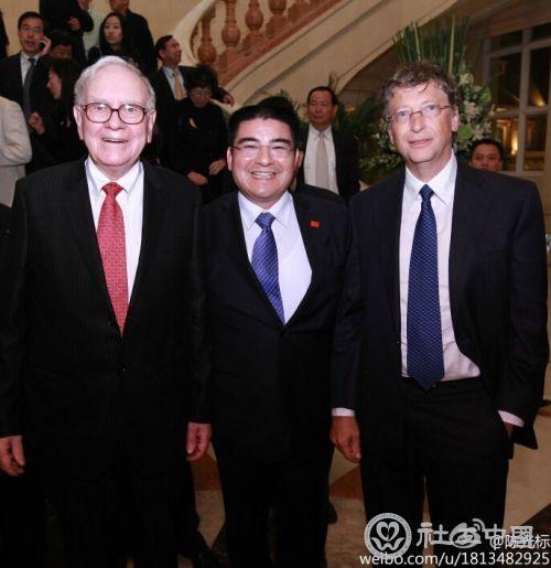 陈光标曾和比尔盖茨巴菲特合影过,他们三人都戴着眼镜,陈光标笑得有点憨厚。