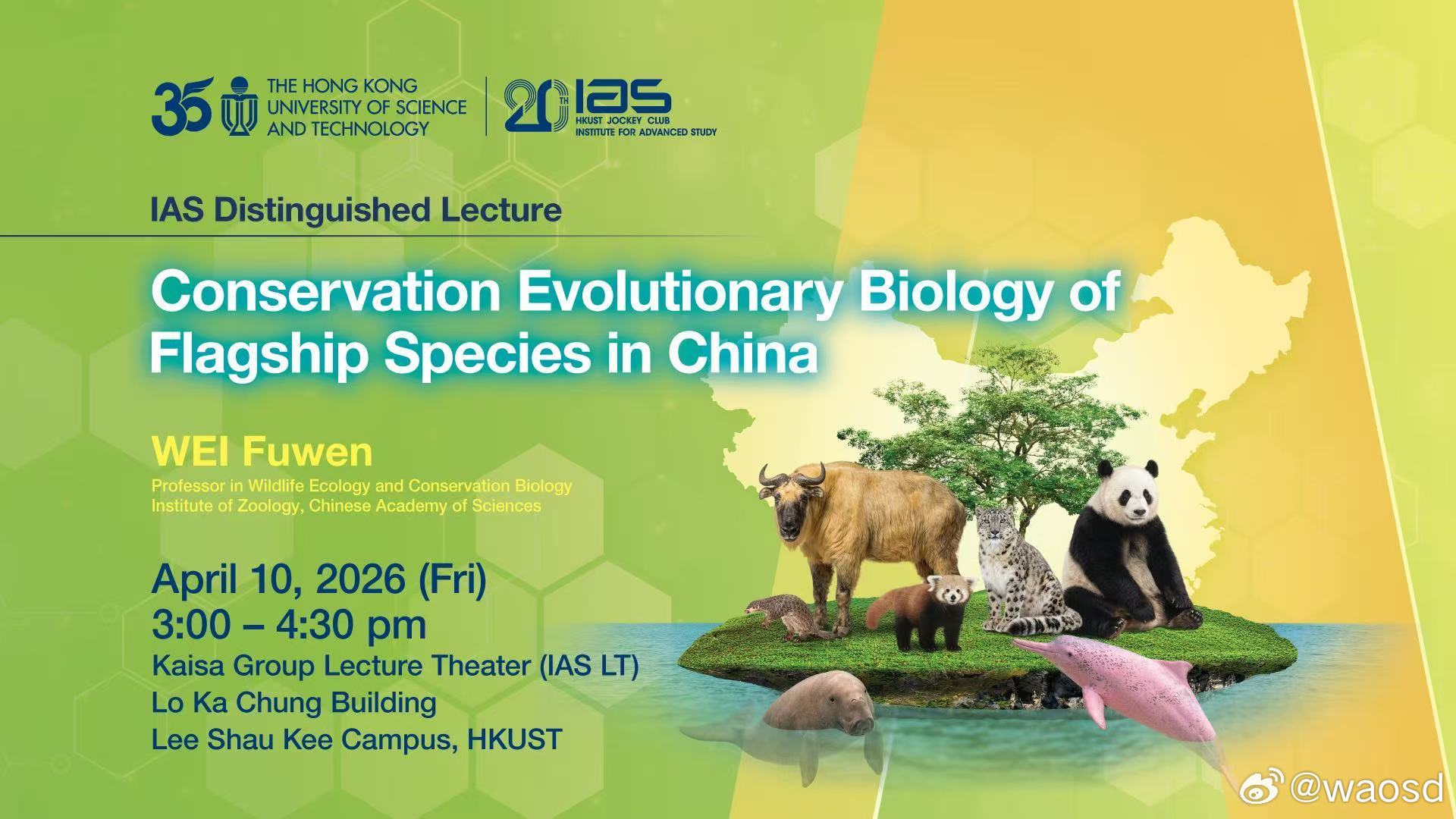 4月10日,香港科技大学将迎来一场学术盛宴! 我们荣幸邀请到中国科学院动物研究所野生动物生态学与保护生物学权威专家——魏辅文教授,带来题为 《中国旗舰物种的保护演化生物学》 的 IAS 杰出讲座。