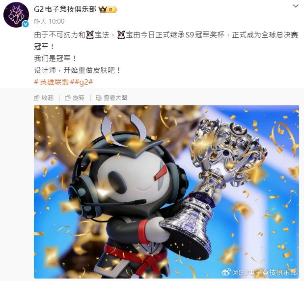 由于不可抗力和🐰宝法,🐰宝由今日正式继承S9冠军奖杯,正式成为全球总决赛冠军!我们是冠军!设计师,开始重做皮肤吧!