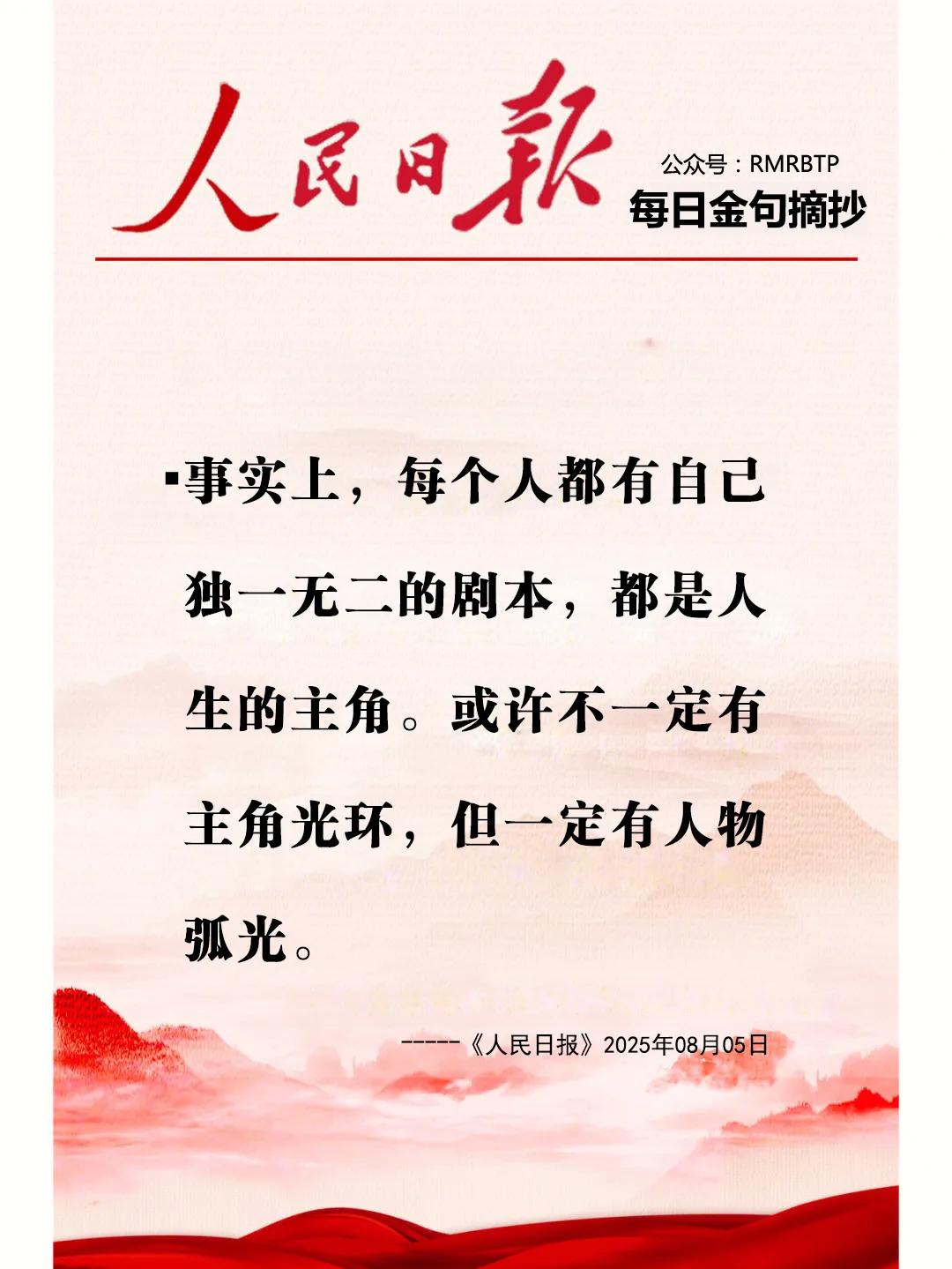 很喜欢人民日报说的这句话: “事实上,每个人都有自己独一无二的剧本,都是人生的主角。或许不一定有主角光环,但一定有人物弧光。” 人生如戏,戏如人生。 你我皆是戏中人, 却总爱仰望别人的剧本。 看那台上,有人天生主角命, 聚光灯下,万人喝彩。 看那幕后,有人默默无闻, 柴米油盐,一日三餐。 可你知道吗—— 真正的戏,不在掌声里, 而在你深夜咬牙的坚持里。 真正的光,不在头顶上, 而在你跌倒又爬起的瞬间里。 人生哪有什么天生开挂? 不过是把一地鸡毛, 扎成了漂亮的掸子。 把满腹心酸, 酿成了温柔的力量。 没有主角光环又如何? 你的剧本,本就独一无二。 平凡日子里的每一次蜕变, 都是属于你的人物弧光。 莫羡他人剧本好, 且看自己戏正酣。 一颦一笑皆入戏, 一步一印自成光。🌹