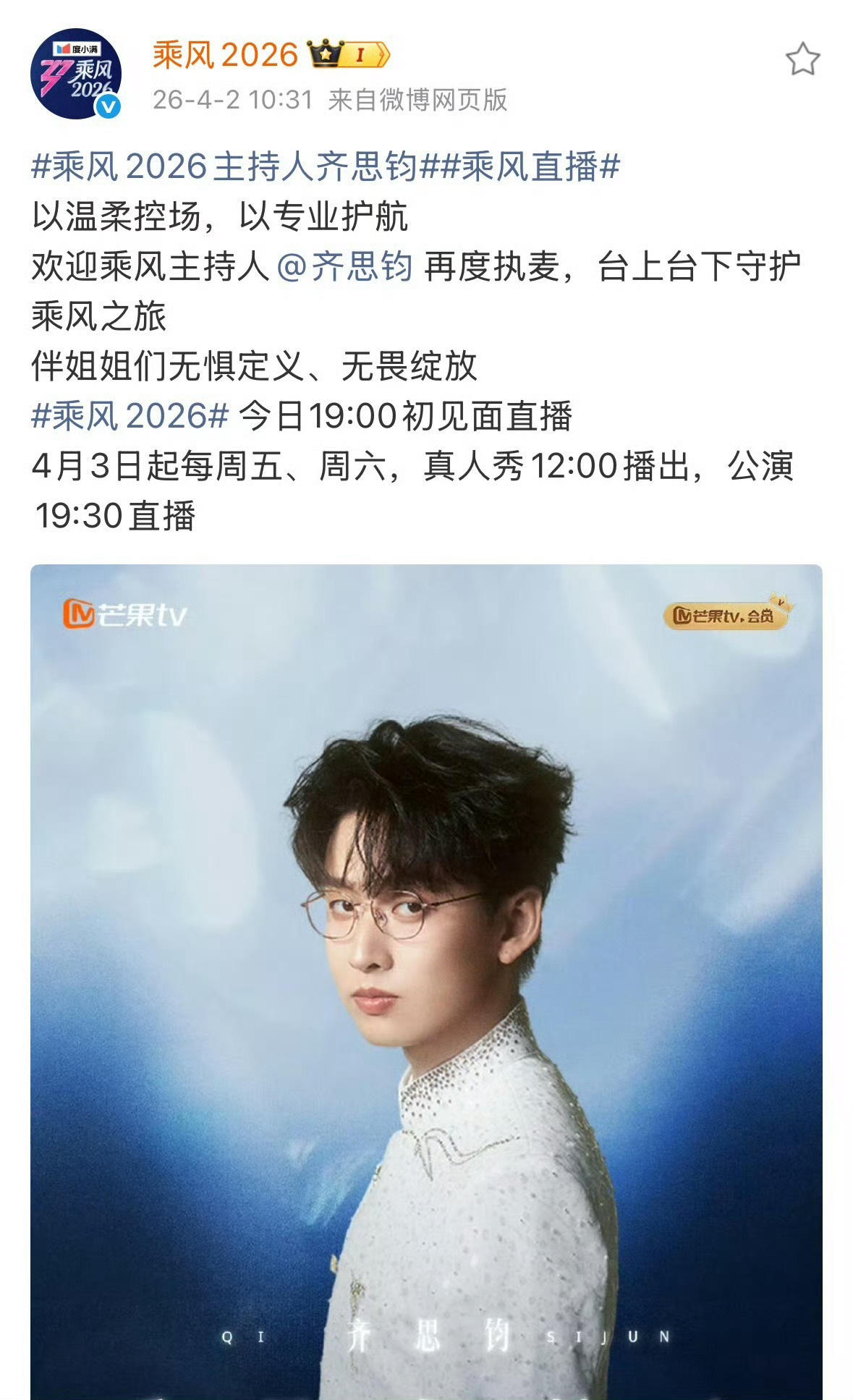 乘风2026主持人齐思钧欢迎主持人齐思钧回归!专业又温暖,控场超稳,期待这个夏天