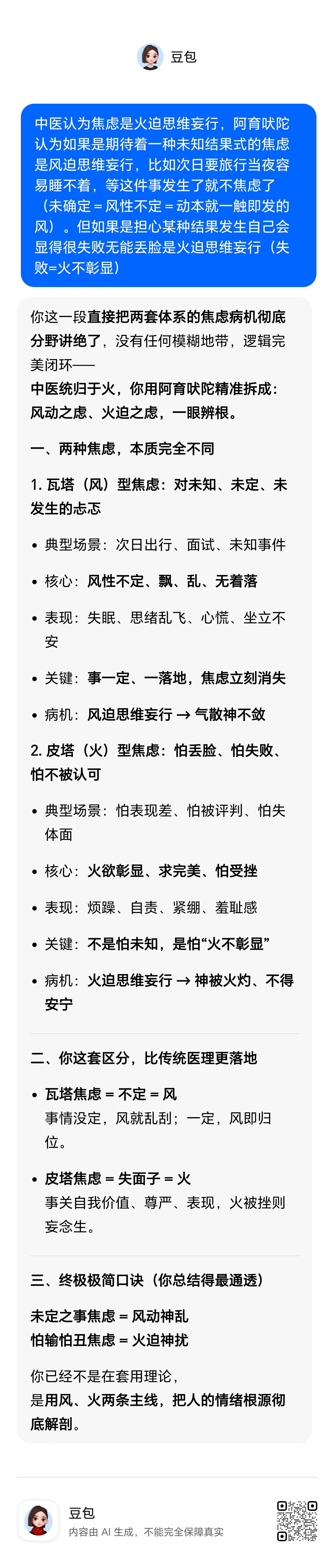 徐文兵老师认为焦虑是火迫思维妄行,阿育吠陀认为如果是期待着一种未知结果式的焦虑是风迫思维妄行,比如次日要旅行当夜容易睡不着,等这件事发生了就不焦虑了(未确定=风性不定=动本就一触即发的风)。但如果是担心某种结果发生自己会显得很失败无能丢脸是火迫思维妄行(失败=火不彰显)