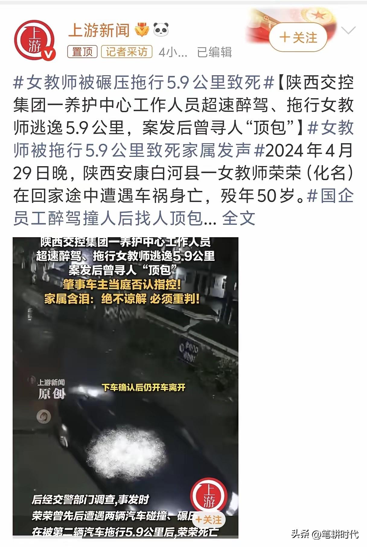 惨不忍睹!5.9公里拖行女教师案遇害全过程曝光,手脚指甲全被抓翻,吊在车底拖行致死。更残忍是事后还串通“顶包”、销毁行车记录仪内存卡,全程无人报警救人 。 而案件悬而未决近两年,遗体仍未下葬。 2024年4月9日晚,陕西安康50岁女教师回家路上遭横祸。先被一辆车撞倒,第二辆车又碾了过来。 男司机醉酒超速,不仅当场碾压,还把她卷入车底。车辆一路行驶,直到晚上9点左右,行至减速带时,车辆受阻停下下车查看才发现车底有人。 司机没停,也没察觉,女教师拼命挣扎想抓住东西,指甲全都磨翻,被拖行近6公里,活活折磨致死。 车上全是国企路产养护中心要员,他们毁证据,把一条人命当成麻烦想甩掉。 酒后肇事,然后发现被害者在车底下时,还继续碾压逃避罪责,这是典型的故意杀人罪? 家属拒70万私了,公职人员知法犯法更是错上加错。