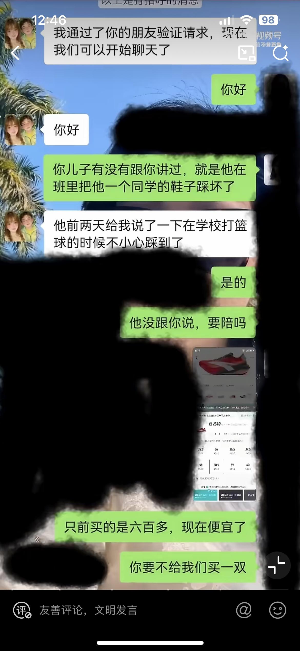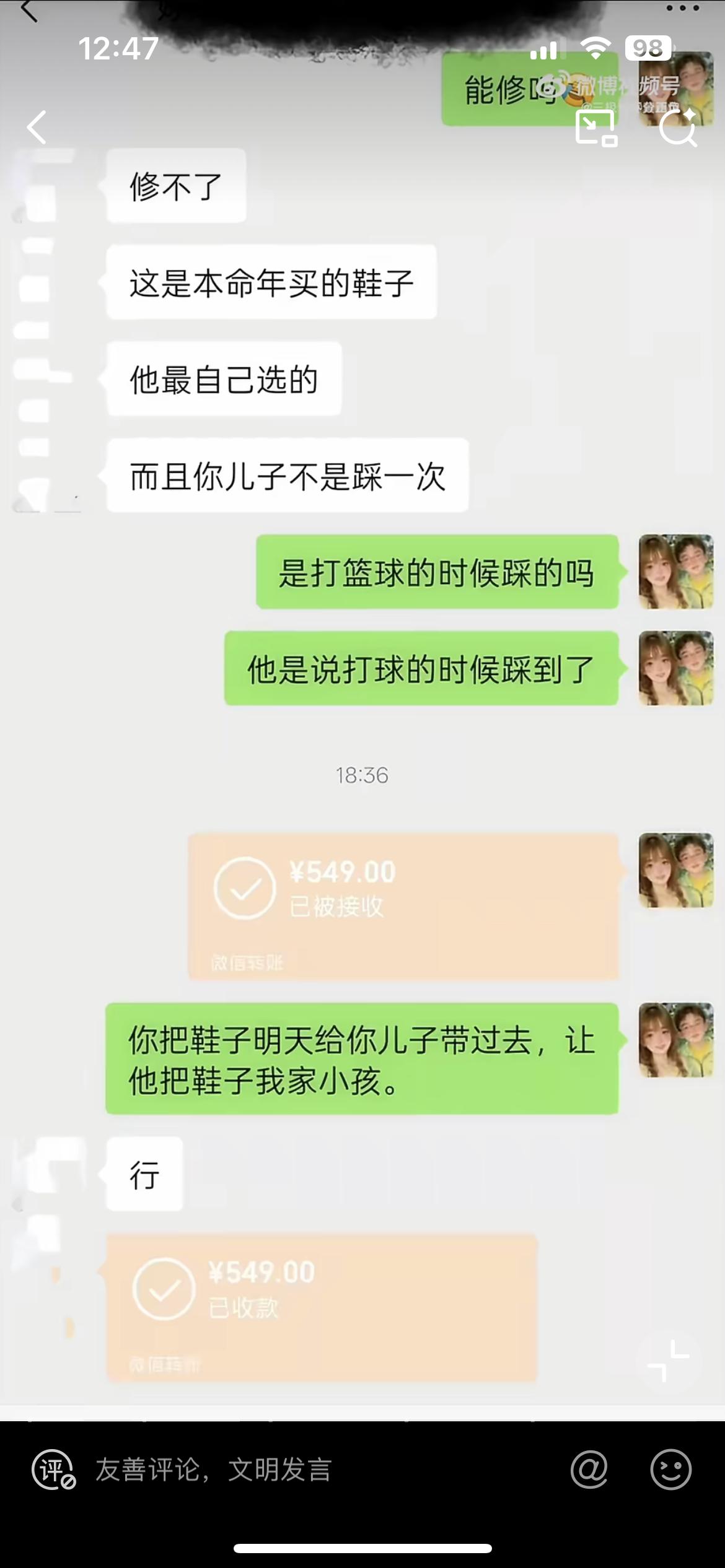 孩子踩坏同学的碳板篮球鞋,家长二话不说花了 549 赔了一双新的,看到同学送回来的鞋,家长傻眼了,这明明是一双旧鞋,碳板根本没坏。家长很生气,就在微信朋友圈蛐蛐了同学的家长,反被他质问。 这名家长的儿子和同学打篮球,不小心踩了他的鞋。不久孩子的家长就接到同学妈妈的微信,说他孩子的篮球鞋碳板被踩坏了,要赔偿,原来 600 多,现在 500 多,这名家长直接下单买了一双新的赔给他,并嘱咐自家孩子把旧鞋拿回来看看。 看到鞋后,和同学的家长说的完全不一样,他说是新鞋,这明明是一双穿了很久的鞋,鞋底碳板还是好好的,压根没有坏,对同学家长的不要脸行为非常的生气。 打篮球是激烈运动,从法律上一直都有风险自担原则,发生碰撞、踩踏如果不是故意的,一般都不用承担责任。况且篮球鞋的碳板是非常结实耐用的,它本身就要承受剧烈运动中的冲击,怎么怎么可能踩两脚就会坏? 家长也做了实验,暴力的踩,根本就不会对碳板构成一点损伤。