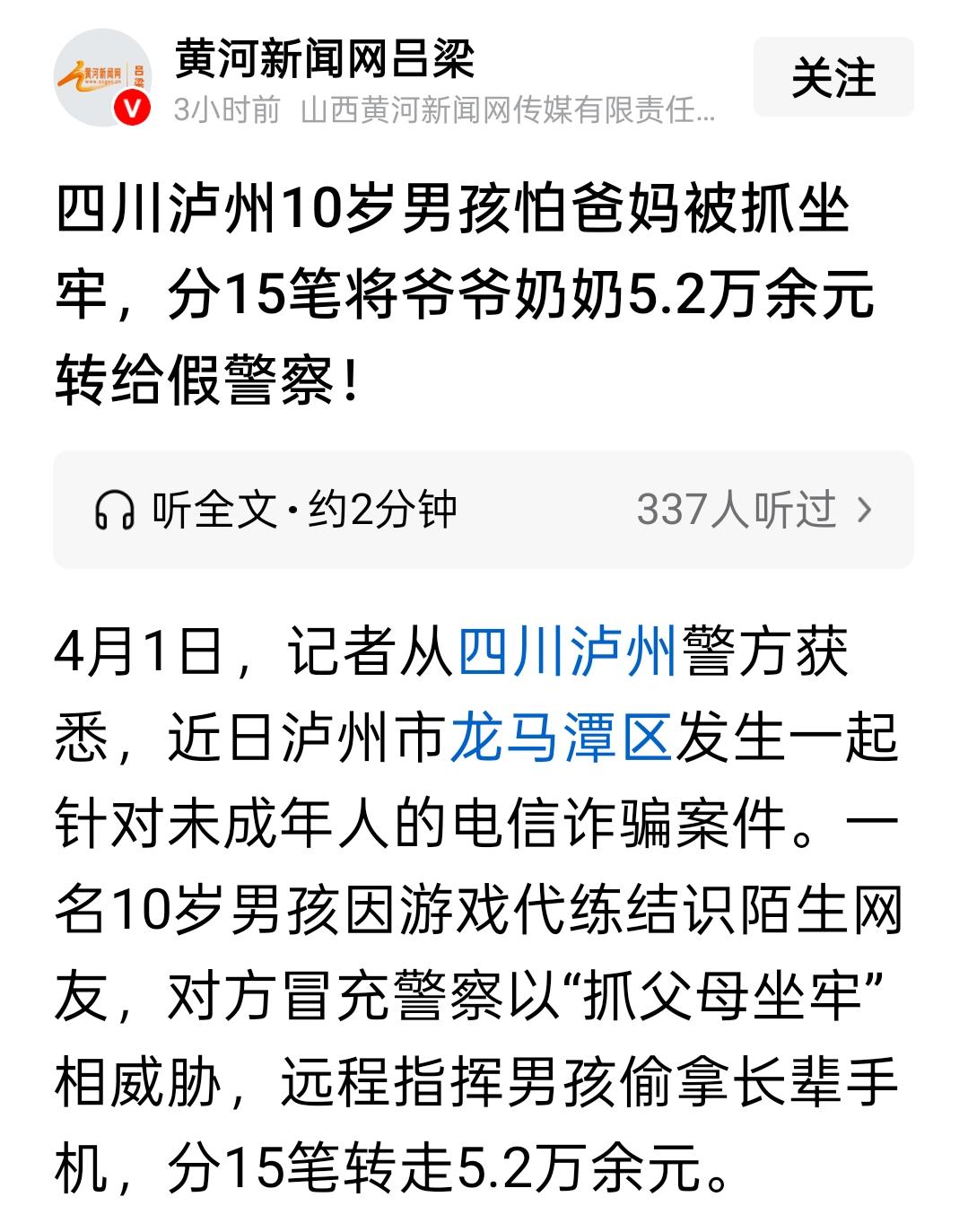 吓出一身冷汗!10岁男孩玩游戏,竟被人远程指挥转走5.2万元,电信诈骗开始向未成年人下手了。 “你爸妈涉嫌犯罪,不配合的话,马上抓他们坐牢!” 就因为这句话,一个10岁的小男孩,被吓得乖乖拿起长辈的手机,一笔一笔地转账,整整15笔,5.2万块,全没了。 这事就发生在四川泸州龙马潭区。 小男孩平时喜欢玩游戏,在网上找了个游戏代练。对方看他年纪小,好骗,就开始“设套”。 先是冒充警察,发来所谓的“警官证”照片,然后语气特别凶:“你爸妈出事了,你不听话,现在就上门抓人!” 一个10岁的孩子,哪经历过这种事?吓坏了,全程按照对方说的做。 偷拿家里长辈的手机、打开支付软件、输入密码……15笔转账,全程被对方远程指挥。 等家里人发现银行卡里的钱没了,孩子还瑟瑟发抖地说:“他说不转钱就要把爸爸妈妈抓走……” 听着都让人心疼。 说实话,看到这条新闻,我心里特别不是滋味。 骗子的手段并不高明,就是抓住孩子对“警察”的天然信任,以及对“父母被抓”的恐惧。 可关键是——孩子的手机里,怎么能有支付密码?长辈的手机,孩子怎么能轻易拿到? 我们总说骗子可恨,但咱们做家长的,是不是也得长点心? 别再觉得“孩子还小,不懂这些”。骗子的手,已经伸到10岁的孩子面前了。 赶紧做两件事: 第一,别把支付密码告诉孩子。 第二,平时多跟孩子讲讲,真警察不会在网上让人转账。 转给身边有孩子的朋友看看,别让下一个受害的,是你家孩子。