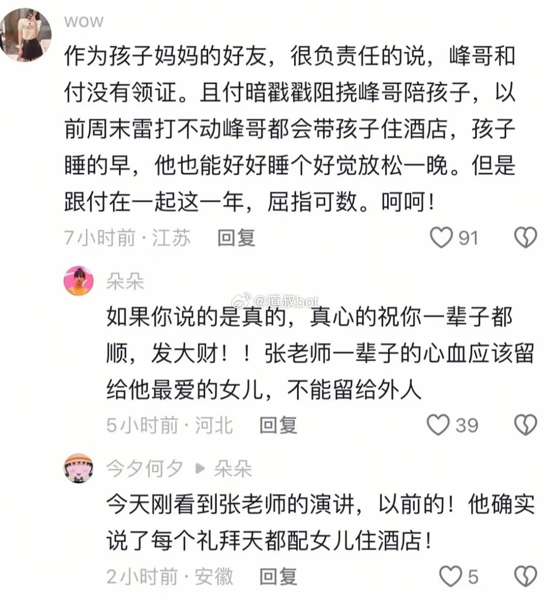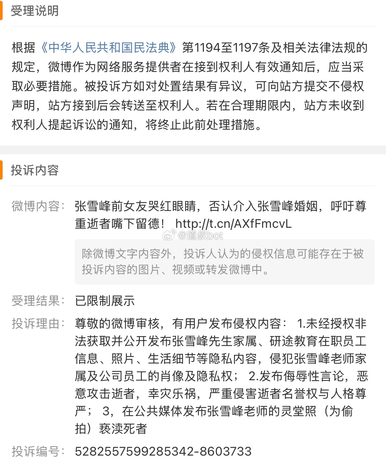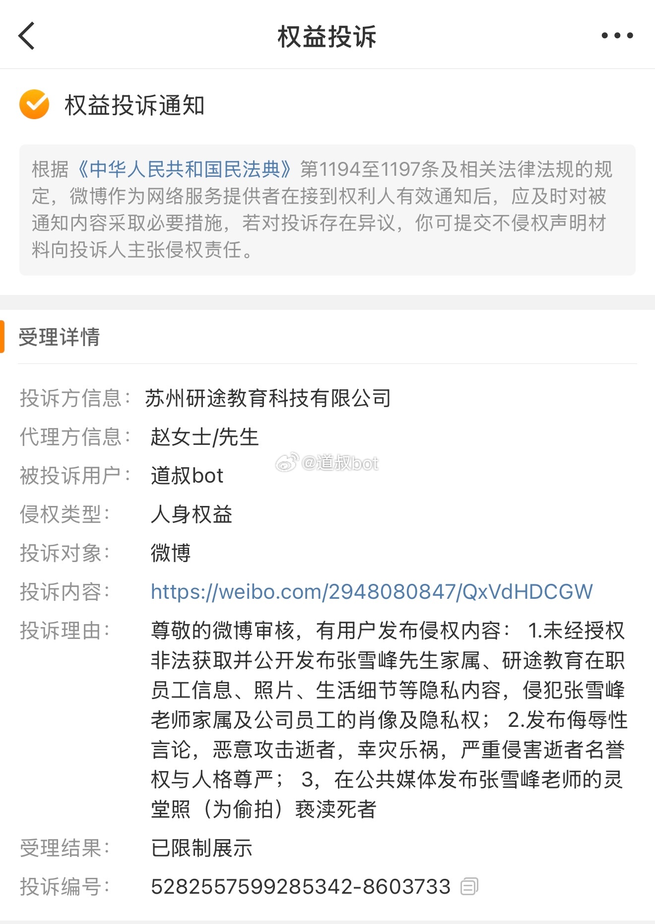 被张雪峰前女友投诉侵权了,投诉方是苏州研途教育科技有限公司,理由是在职员工信息?早前前女友辟谣不是小三不是包养,是携手走过三年的家人!还晒了张雪峰给她买了5斤黄金用来首付房子,不过人死了跳出来说张雪峰的各种私事,也是对死者的一种不尊重!